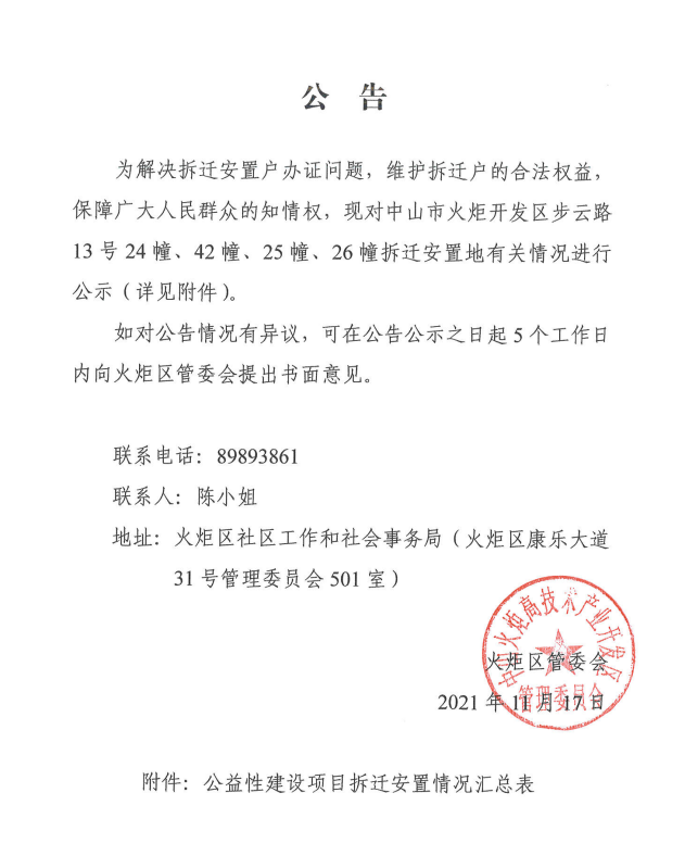 中山火炬开发区步云路公益性建设项目征地拆迁安置情况公告