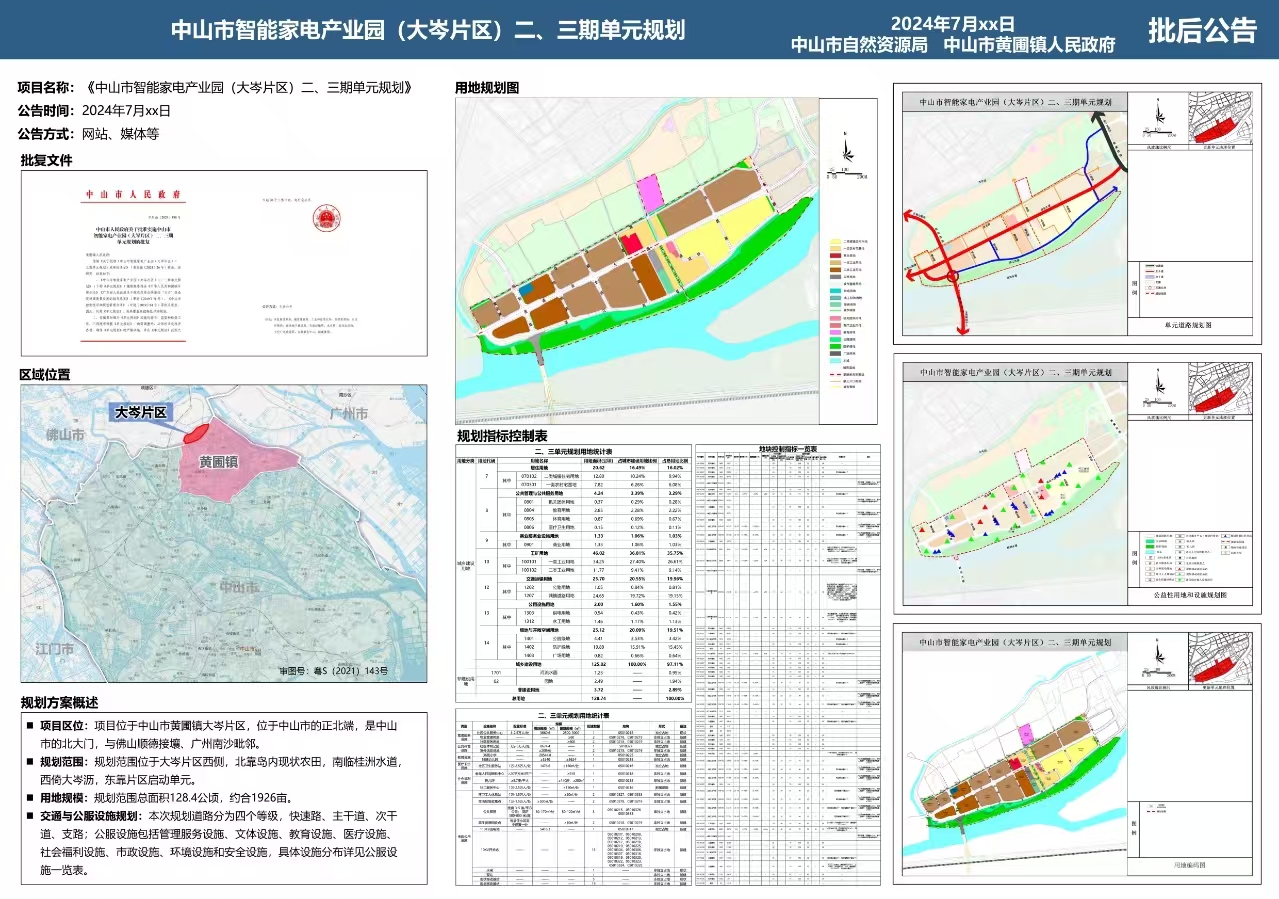 《中山市智能家电产业园(大岑片区)二、三期单元规划》经51黑料 批复(中府函〔2024〕198号),自批复之日起实施。现根据《中华人民共和国城乡规划法》等相关法律法规要求予以批后公布,有关规划成果内容可在中山市自然资源局网站(//51hltop.com/zrzyj/)、中山市黄圃镇人民政府网站(//51hltop.com/hpz/)查询。