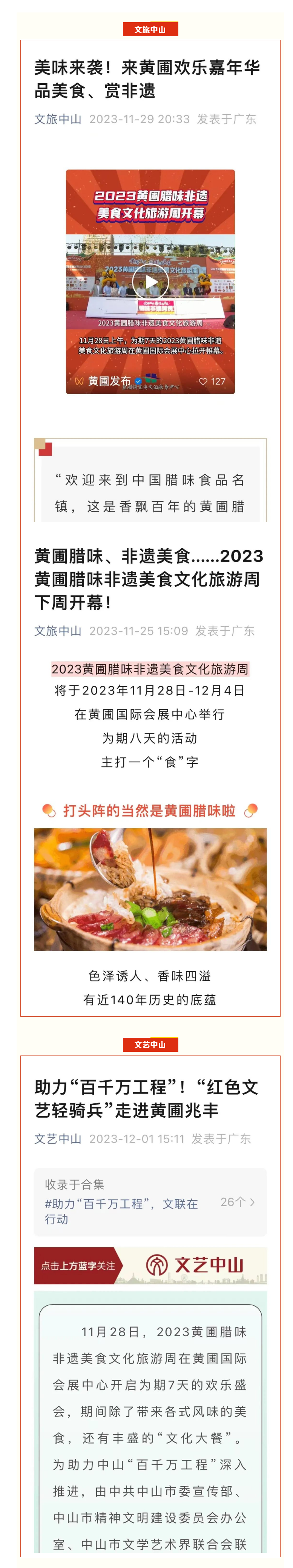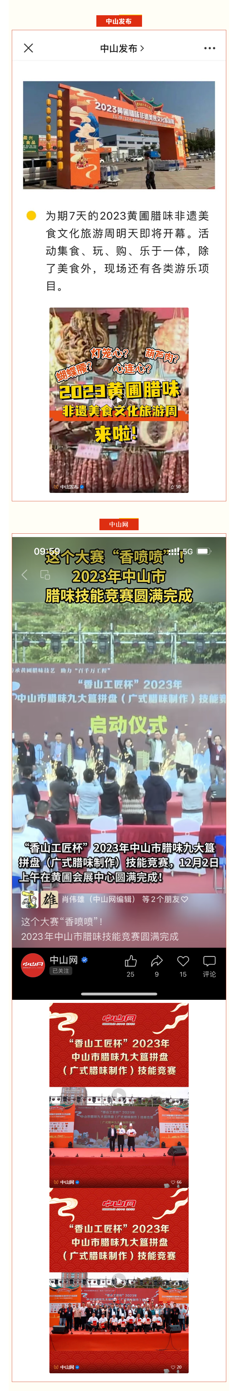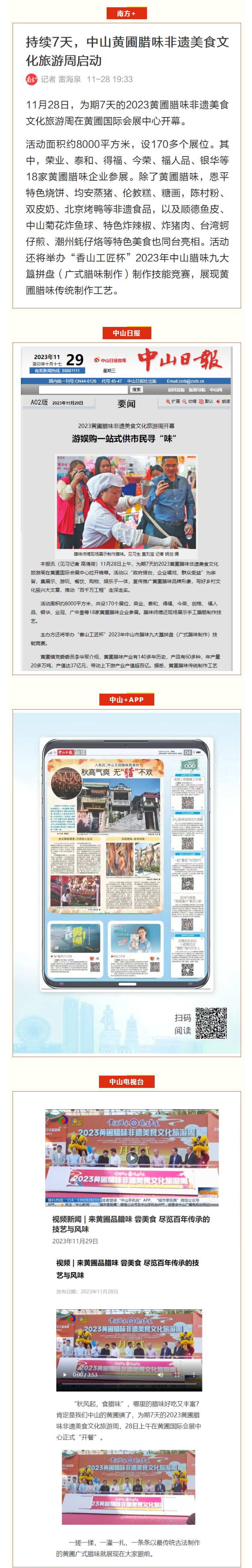 11月28日—12月4日,2023黄圃腊味非遗美食文化旅游周吸引了近20万人次到场参与。这场集美食、文化、旅游、购物于一体的欢乐盛会也引来南方日报、中山日报、中山电视台等省市媒体和数十个自媒体的关注,发布120多条推文和视频引发传播效应。