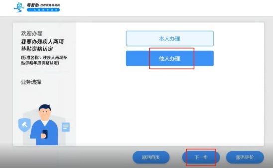 3.若本人不方便进行操作,可以由亲朋好友协助,选择“他人办理”,填写申办人信息,点击“下一步”,进行人脸识别后完成资格认定。