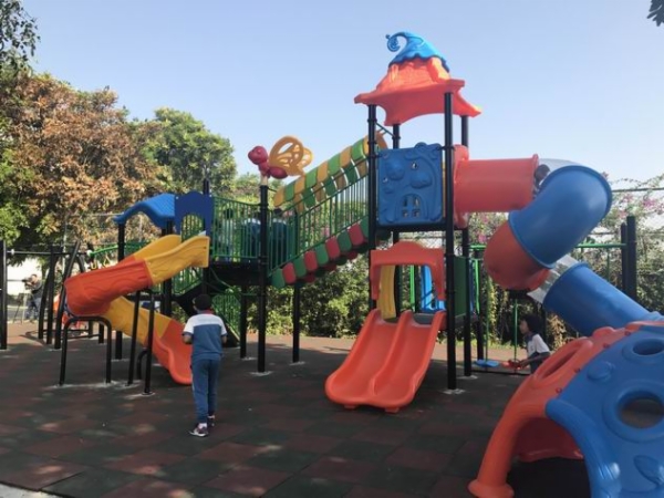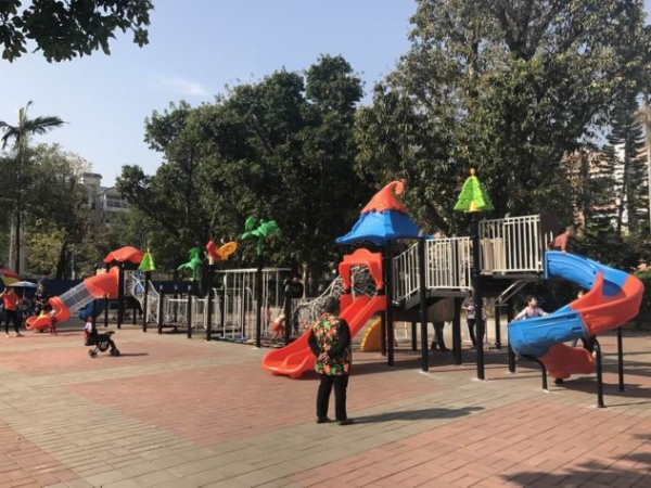 走进民众公园,五彩斑斓的儿童活动设施映入眼帘,广场上传来小朋友们嬉戏玩耍的欢笑声。一群“小不点儿”正在排队滑滑梯。