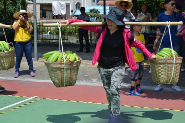 (市民:在港口过来的,第一次来民众。//这里的人很热情,现场也很整齐、很干净,我担了60斤的香蕉,体验了一次,很重。)