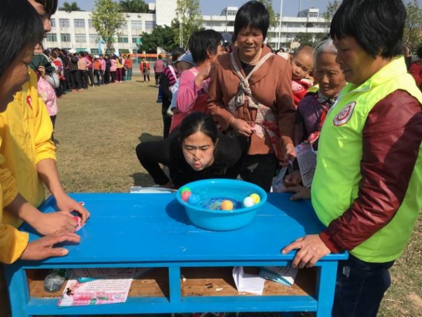 表演过后,新平村的妇女们参加村委为她们准备的游园活动,有“盲公敲锣”、“水上吹乒乓球”、“定点抛球”等有趣的小游戏,既挑战了女性同胞们身体的运动能力、反应能力等,还考验了女性同胞之间的协调配合能力等。女士们都玩得开心又过瘾,在小票上盖满了章还可以领取丰富的奖品。