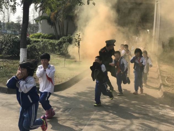 演练现场,消防官兵通过释放烟雾弹,模拟教室发生火灾为警情,引导学生用湿毛巾捂着口鼻,按照指定路线,迅速有序地紧急疏散到学校的运动场。警报一响,各楼道负责人迅速到位,指挥学生疏散。
