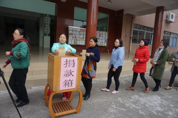 早上课间操时间,民众中学组织全校教师、学生参与捐款活动,教师排好队伍,手持善款,陆续走向捐款箱,将爱心投递。之后学生代表把在班级收集到的善款投入捐款箱。经过统计,学校教师共捐款11888元,学生捐款总数14351.2元,全校合计捐款26839.2元。
