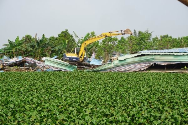 从今年4月11日开始,我镇已经召开“两违”清拆组协调会,4月17日,兽医站对禁养区各个养殖场下发禁养通知,要求在3个月内自行清拆,并组织养殖户参加清理工作说明会议并签订自行清拆承诺书。浪网村目前4个养殖场存栏量分别为:温某250头,黄某80头。赖某、梁某存栏猪只已全部清理。8月14日上午,由镇农业农村工作局牵头,浪网村组织协调,镇城管、环保、兽医等部门共同参与,对上述4户猪场实施强制拆除,其中赖某900平方米生猪棚舍已完全拆除。温某、黄某、梁某的生猪棚舍已分别拆除700平方米、300平方米、260平方米(总面积分别为2100平方米、500平方米、800平方米)。
