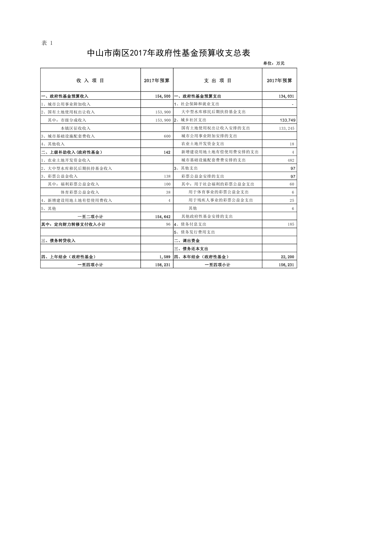 中山市南区2017年政府性基金预算收支总表