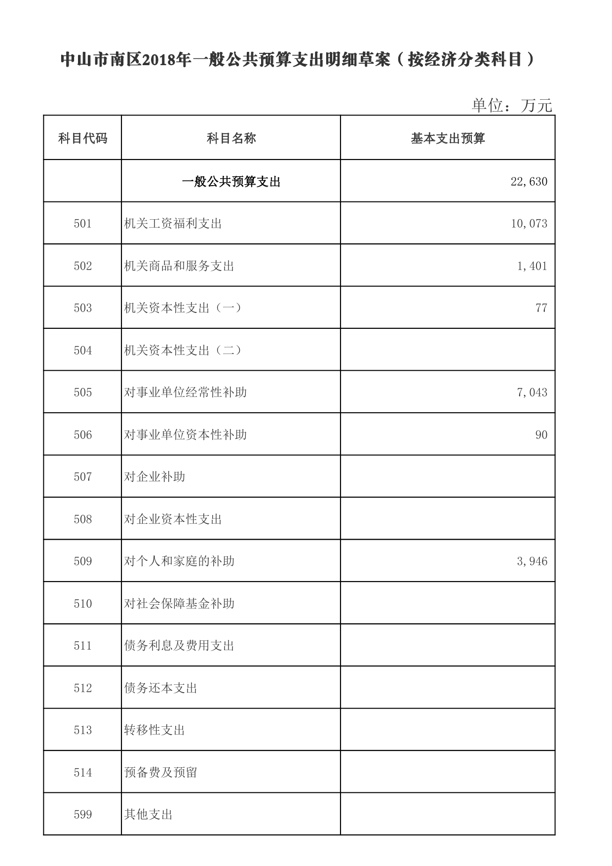 中山市南区2018年一般公共预算支出明细草案(按经济分类科目)