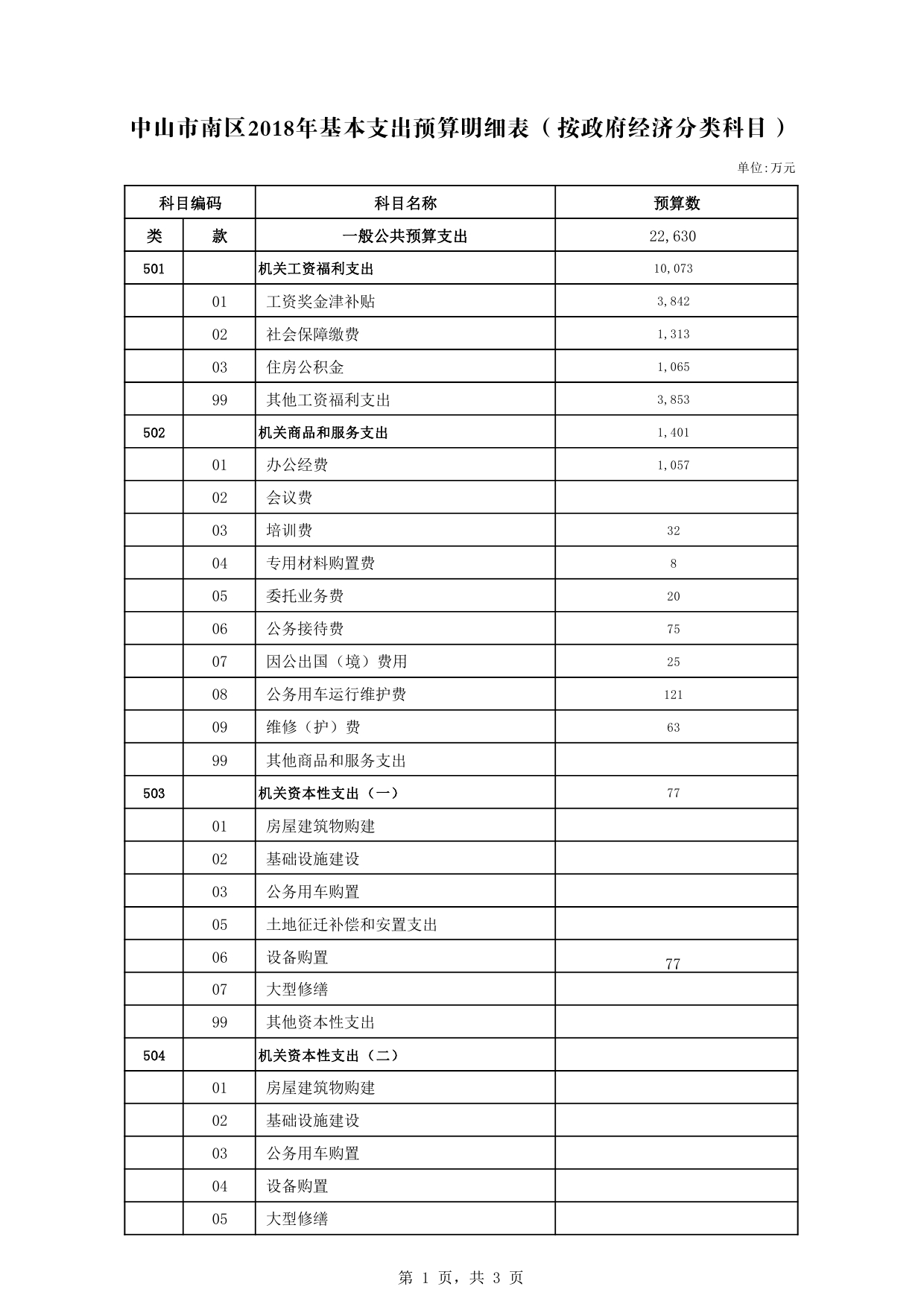 中山市南区2018年基本支出预算明细表(按政府经济分类科目)