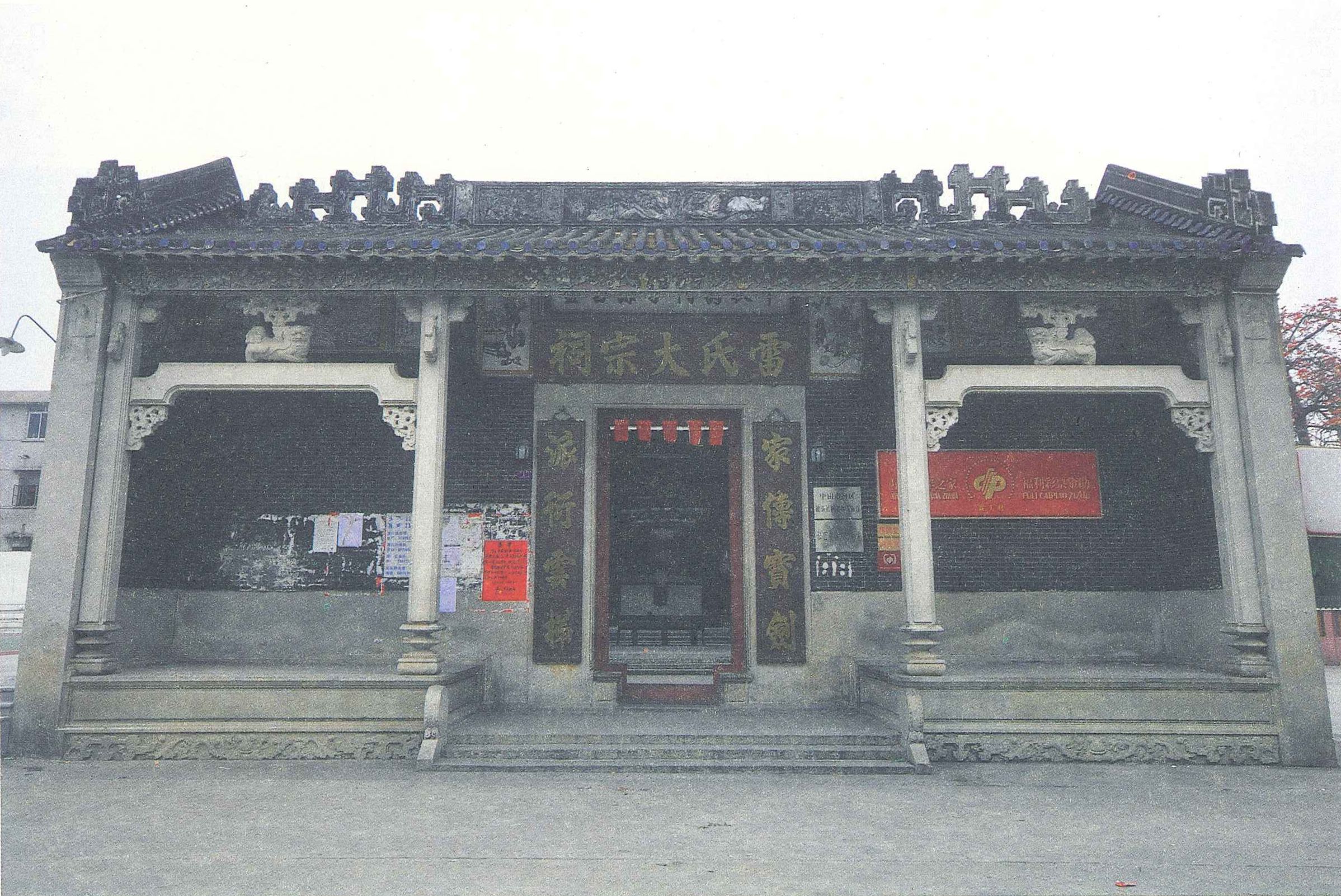 渡头雷氏大宗祠位于广东省中山市南区渡头社区云梯里1号,始建于清康熙年间,光绪十五年(1889)、1999年重修。祠堂坐北向南,三间三进,面阔13.2米,纵深37.15米,面积约484平方米。硬山顶,青砖墙,花岗岩墙脚,博古脊。每两进间夹一天井,天井两旁有廊。蓝釉瓦当、滴水,门前台阶两侧各有一抱鼓石,头门前廊有四根石檐柱,石质瑞兽托脚、雀替、挑头,两侧有塾台。头门为硬山搁檩,中堂、后堂为抬梁与穿斗混合式梁架,梁架由四根木质金柱支撑。该建筑为当地较为典型的清代祠堂建筑。