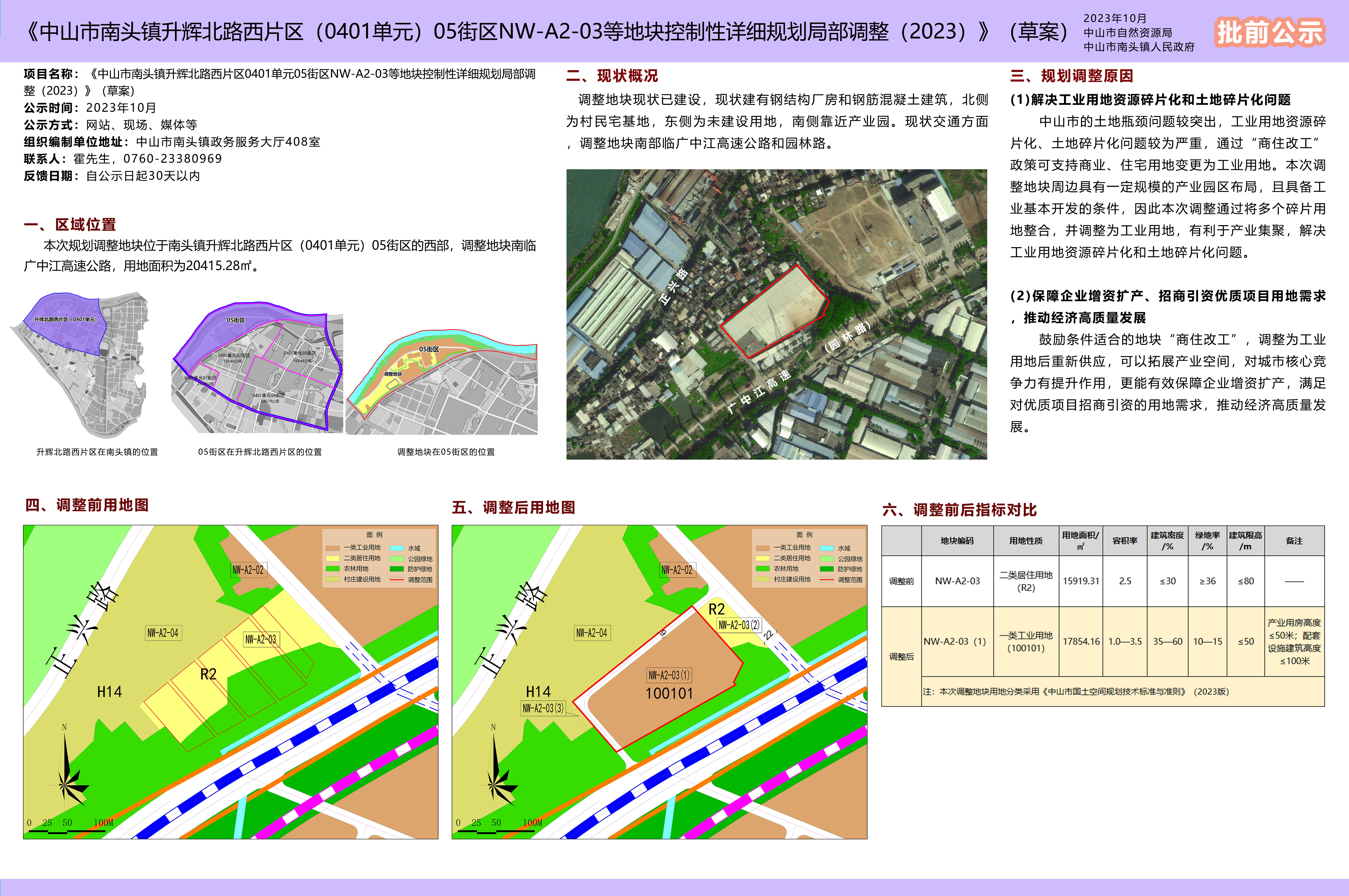 关于《中山市南头镇升辉北路西片区(0401单元)05街区NW-A2-03等地块控制性详细规划局部调整(2023)(草案)》的公示