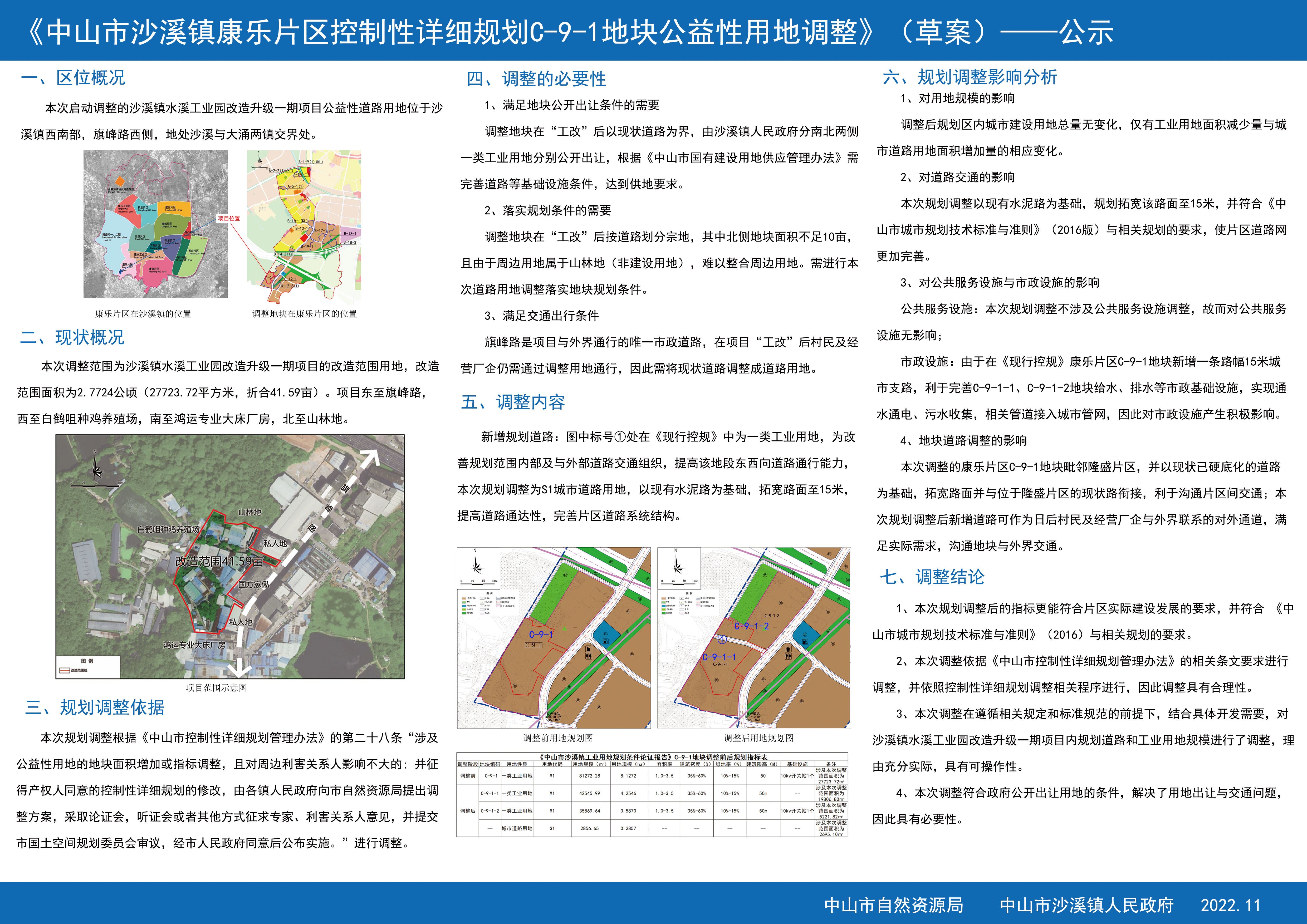 《中山市沙溪镇康乐片区控制性详细规划C-9-1地块公益性用地调整》草案已通过相关审查程序。根据《中华人民共和国城乡规划法》等相关法规要求,现对该草案予以公示。