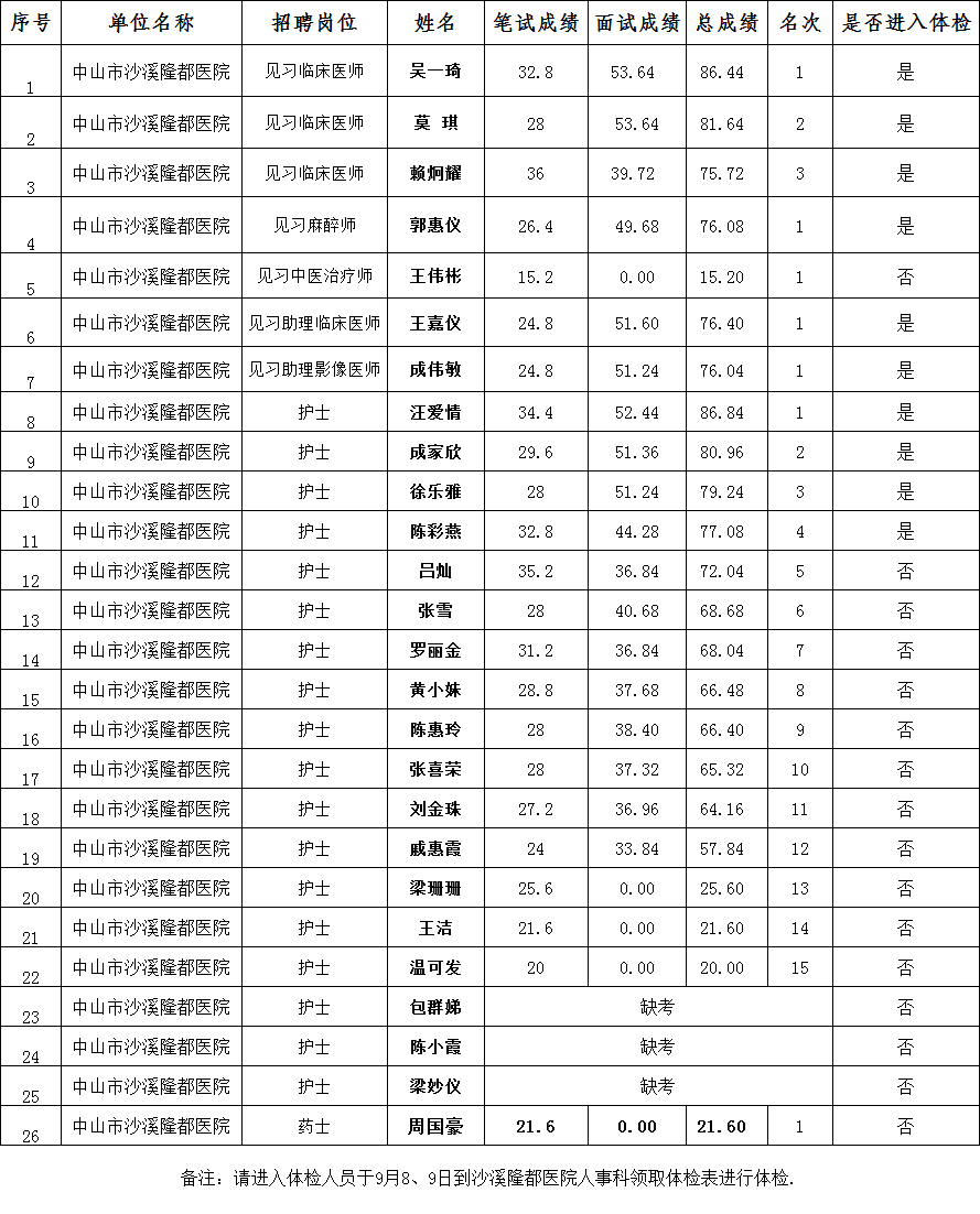 中山市沙溪隆都医院2016年第1期公开招聘合同制工作人员成绩汇总表