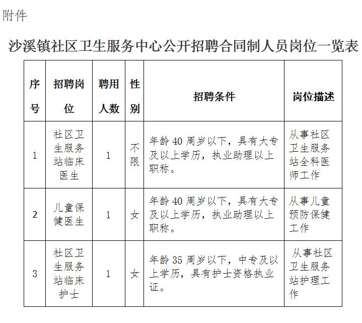 沙溪镇社区卫生服务中心是沙溪镇镇属一类事业单位,由于工作需要,经研究,决定面向社会招聘合同制工作人员叁名,现将有关事项公告如下: