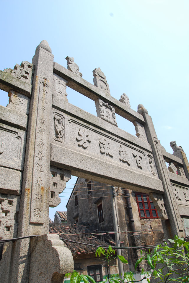 位于沙溪镇圣狮村,建于清代宣统二年(1910年),为四柱三间通天式牌坊,用花岗石雕构筑,高约6米。牌坊柱下镶抱柱石,柱上石狮柱头,人物花卉雕刻。