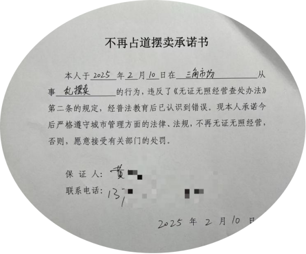 对初次违规的摊贩所暂扣物品全部存放在属地村委会,摊贩去领回物品前,须接受村道路安全警示教育,摊主及其亲属需在村自愿签订《马路安全风险告知书》和《不再占道摆卖承诺书》,承诺今后不再在市场路段的马路两侧设摊经营,自觉遵守城市管理规定,维护市容环境整洁有序。