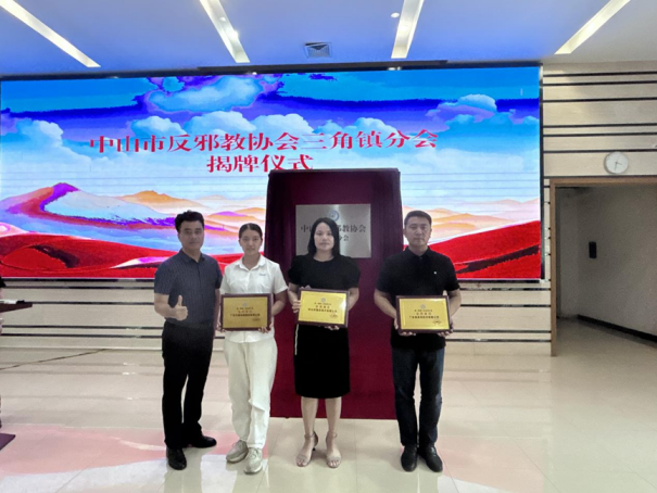 三角镇党委副书记梁庆明,中山市反邪教协会秘书长郑雪绮、监事长罗东,三角镇平安法治办、党政办、公安分局、宣教办、公共服务办、妇联、各村(社区)、蟠龙小学及各会员单位相关负责人参加揭牌仪式。