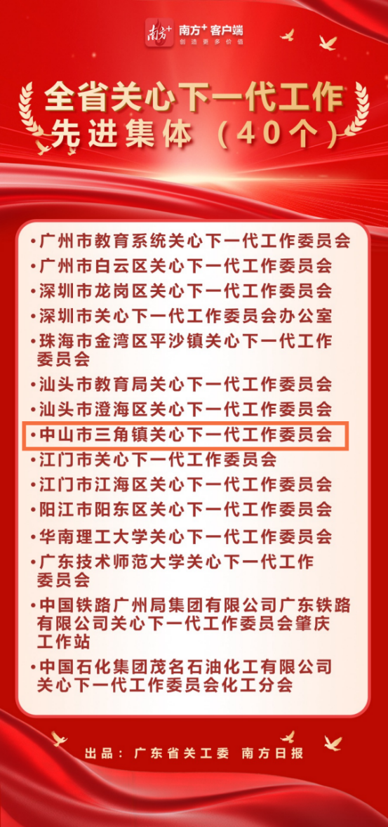 近日,纪念广东省关工委成立25周年暨全省关心下一代工作表彰会议在广州召开,省关工委和省文明办联合表彰40个“全省关心下一代工作先进集体”和80名“全省关心下一代工作先进个人”。三角镇关心下一代工作委员会被授予“全省关心下一代工作先进集体”称号,是中山市唯一一个获此殊荣的镇街级关工委。