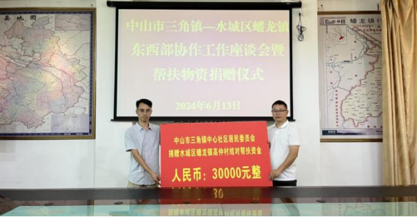 2024年三角镇与贵州省六盘水市水城区蟠龙镇结对,三角镇商会与蟠龙镇百车河社区结对,三角镇中心社区居委会与蟠龙镇木河社区、发贡村、高仲村、营发村、二道岩村以及猴场苗族布依族乡双贡村、黄果树村结对,1镇8村均已重新签订结对协议。