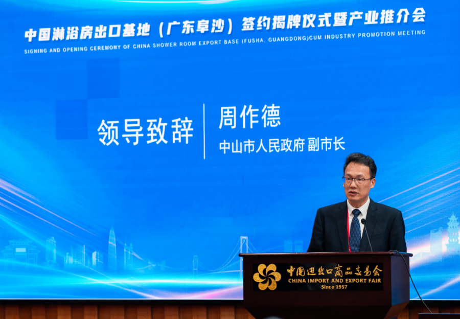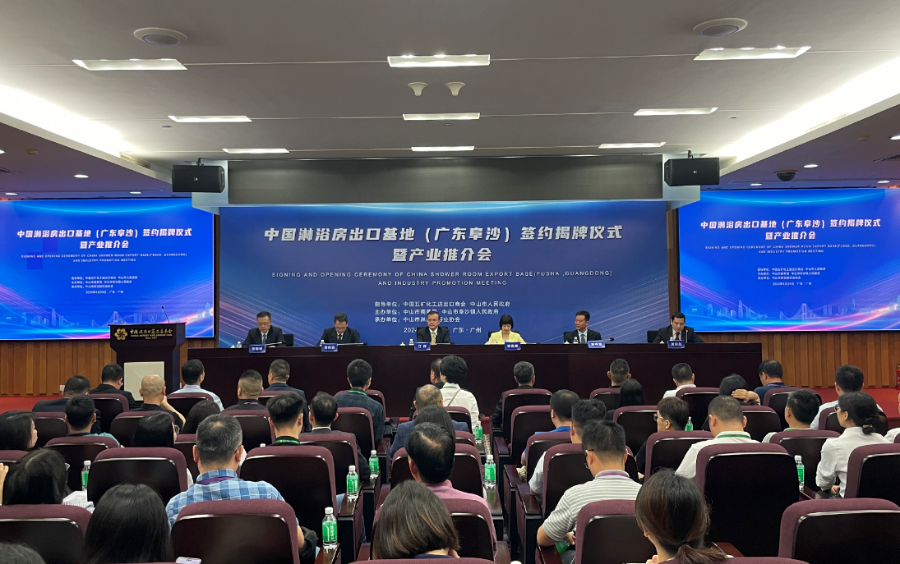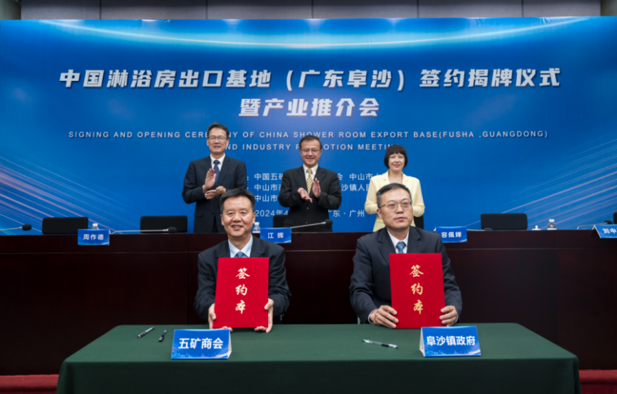 4月24日下午,由我市与中国五矿化工进出口商会共同举办的“中国淋浴房出口基地(广东阜沙)签约揭牌仪式暨产业推介会”在第135届广交会展馆顺利举行。