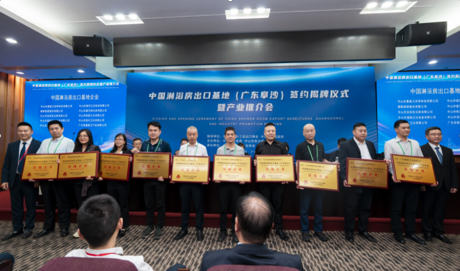 在“基地企业授牌仪式”环节,中山市商务局副局长刘威良、阜沙镇党委副书记黄开枝共同为朗斯家居股份有限公司、中山市福瑞卫浴设备有限公司、中山市瑞莎卫浴科技有限公司、中山市皓霖卫浴有限公司、中山市现代卫浴有限公司、广东高德厨卫产品有限公司等10家企业授予“中国淋浴房出口基地企业”牌匾。