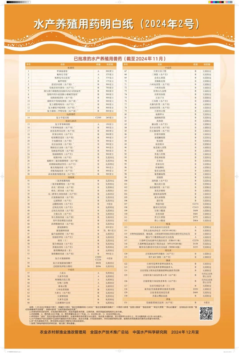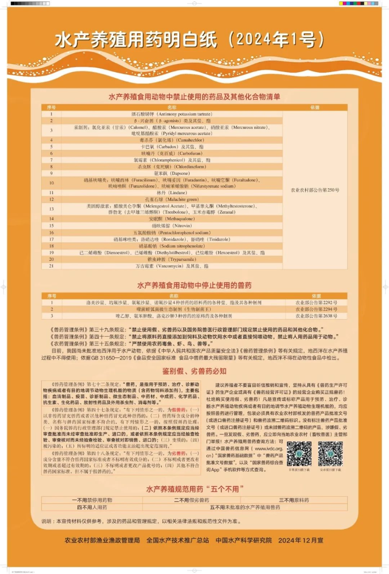 为指导水产养殖者科学规范用药,防范水产品中兽药残留超标,进一步提高质量安全水平,农业农村部渔业渔政管理局组织全国水产技术推广总站、中国水产科学研究院等单位,对国家出台的水产养殖用药有关规定进行了整理,形成了《水产养殖用药明白纸(2024年1、2号)》,请各水产养殖单位、养殖户留意关注,详见附件。