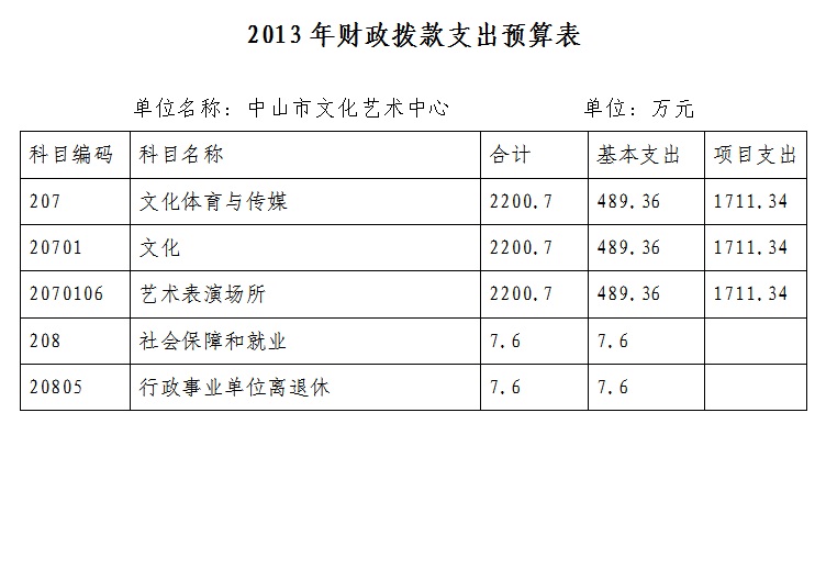 、项目支出:1711.34万元,主要用于艺术表演场所的艺术演出活动、公益文化活动、设备设施维修维护、中山市文化艺术中心及中山市文化馆的物业管理费用、水电费用及相关税收等方面。