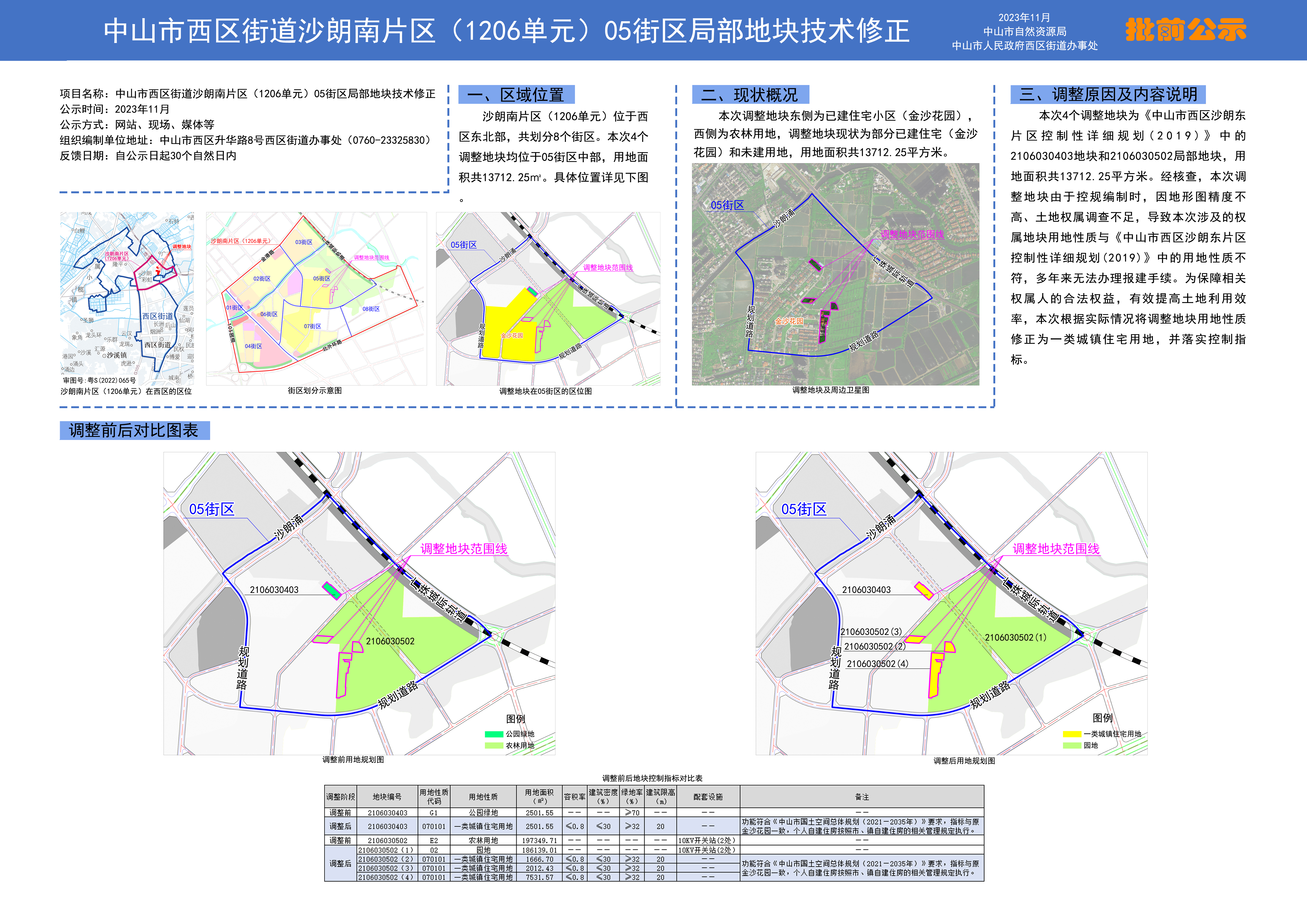 《中山市西区街道沙朗南片区(1206单元)05街区局部地块技术修正》草案已编制完成。根据《中华人民共和国城乡规划法》等相关法规要求,现对该草案予以公示。