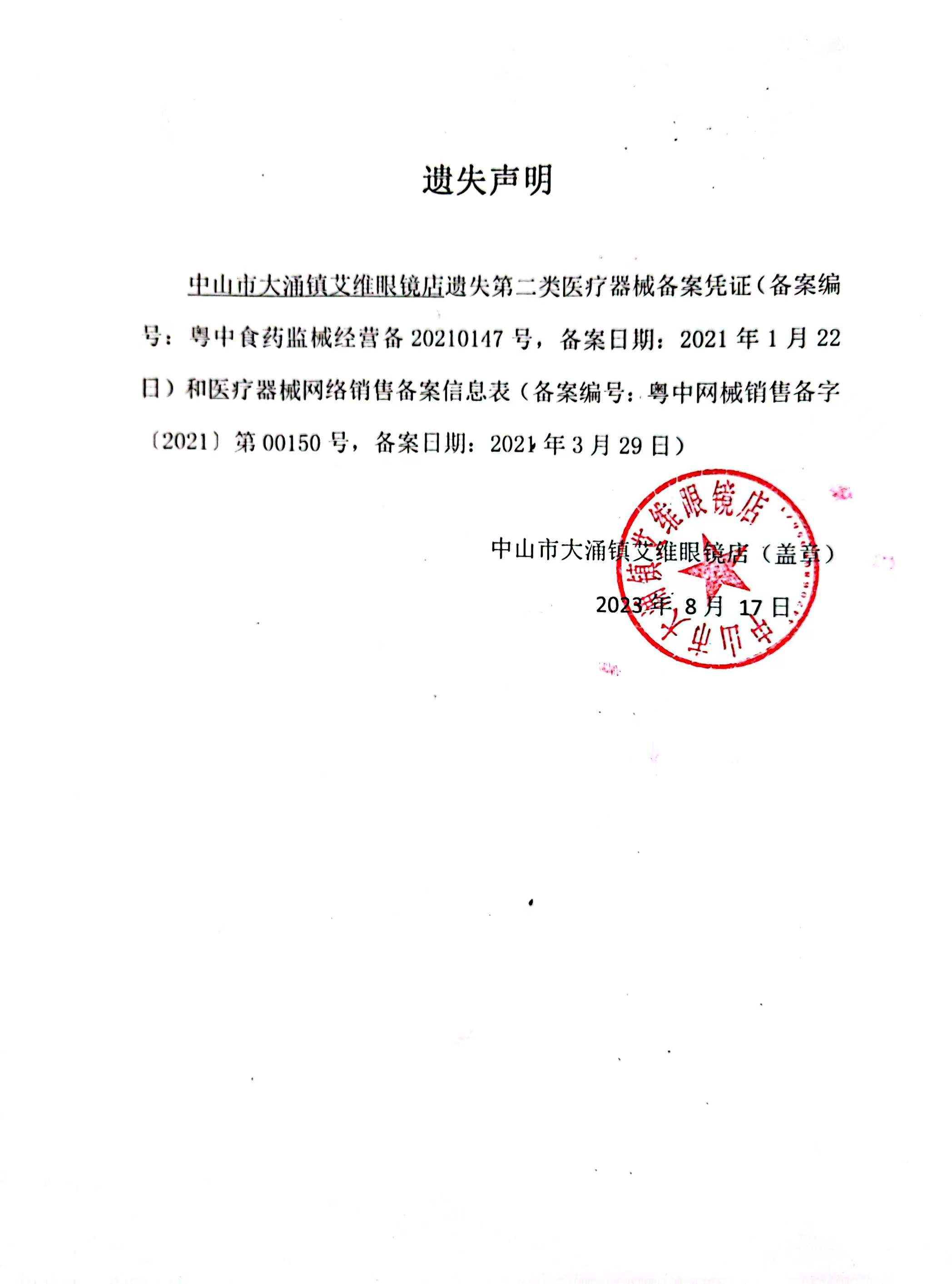 遗失声明(中山市大涌镇艾维眼镜店)
