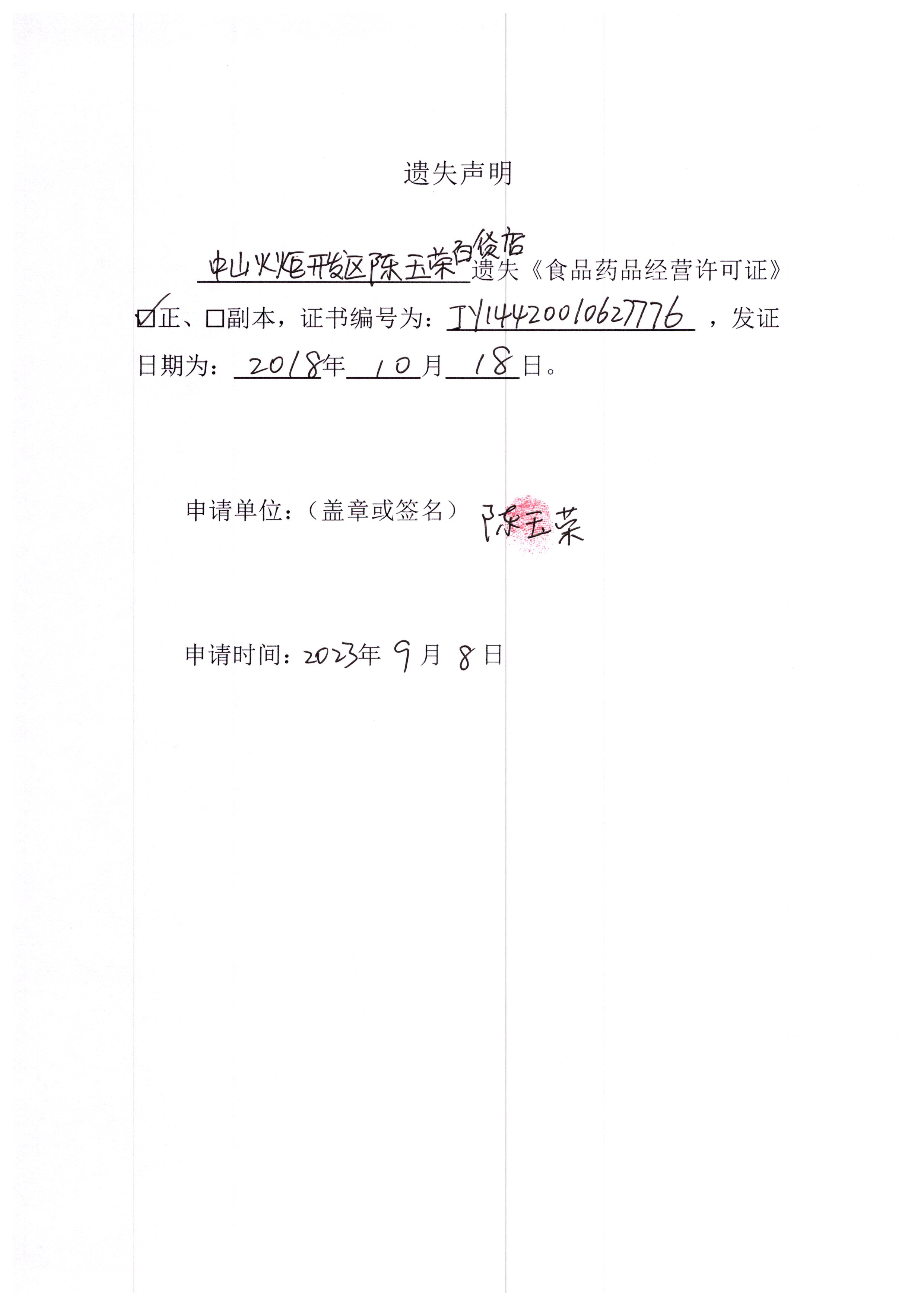食品药品经营许可证遗失声明(中山火炬开发区陈玉荣百货店)