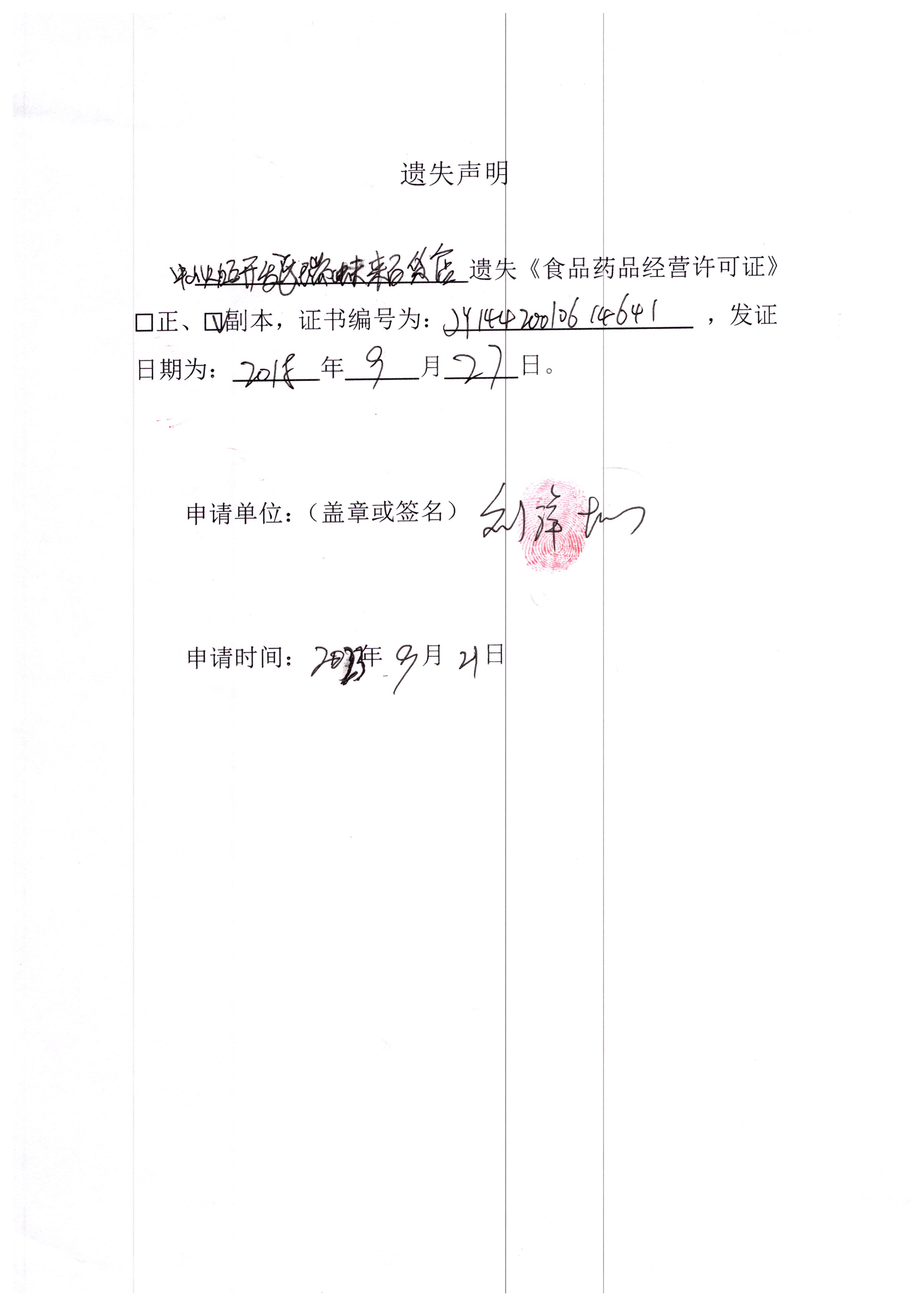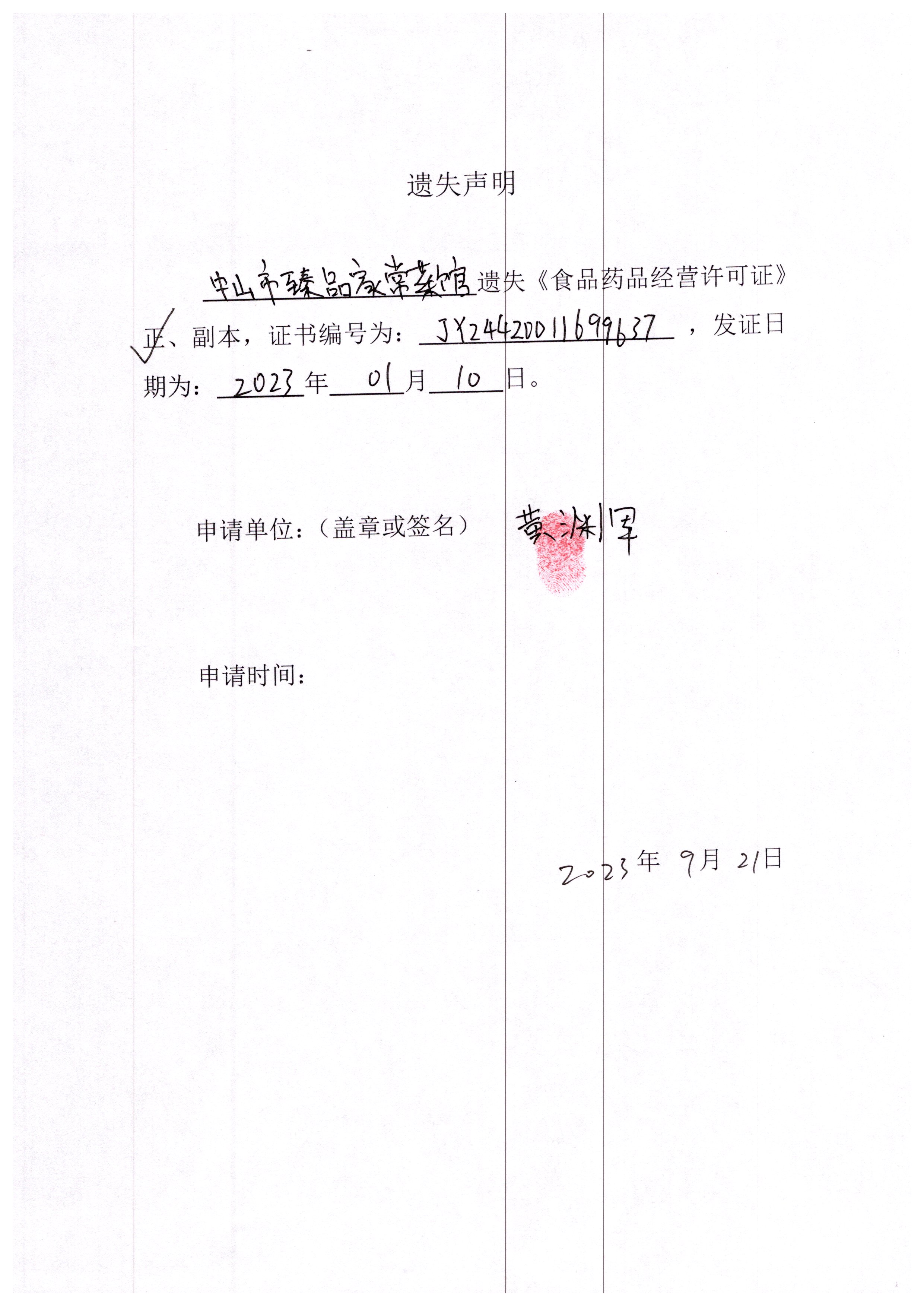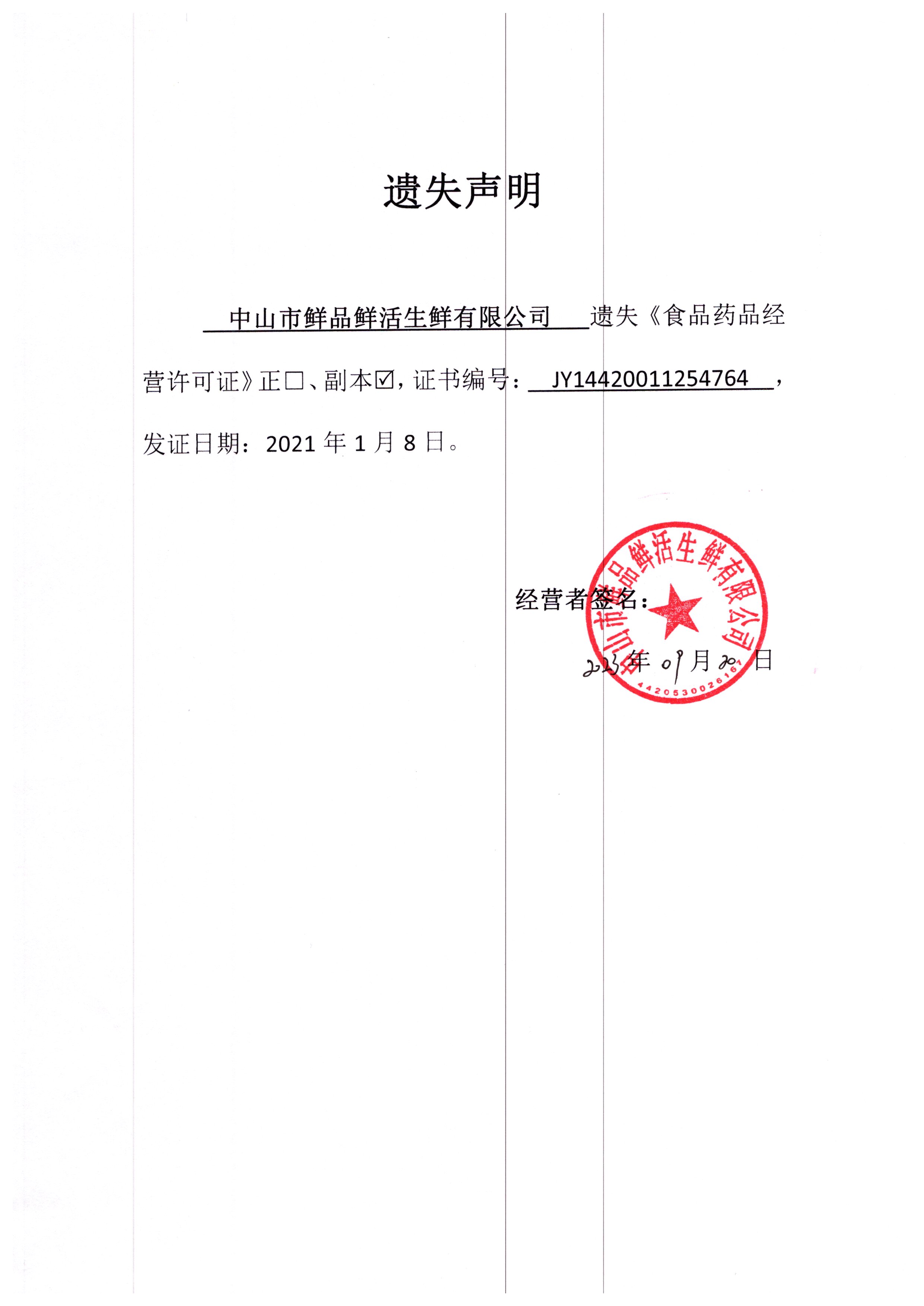 食品药品经营许可证遗失声明(中山市臻品家常菜馆、中山市鲜品鲜活生鲜有限公司、中山火炬开发区瑞蚨来百货店)
