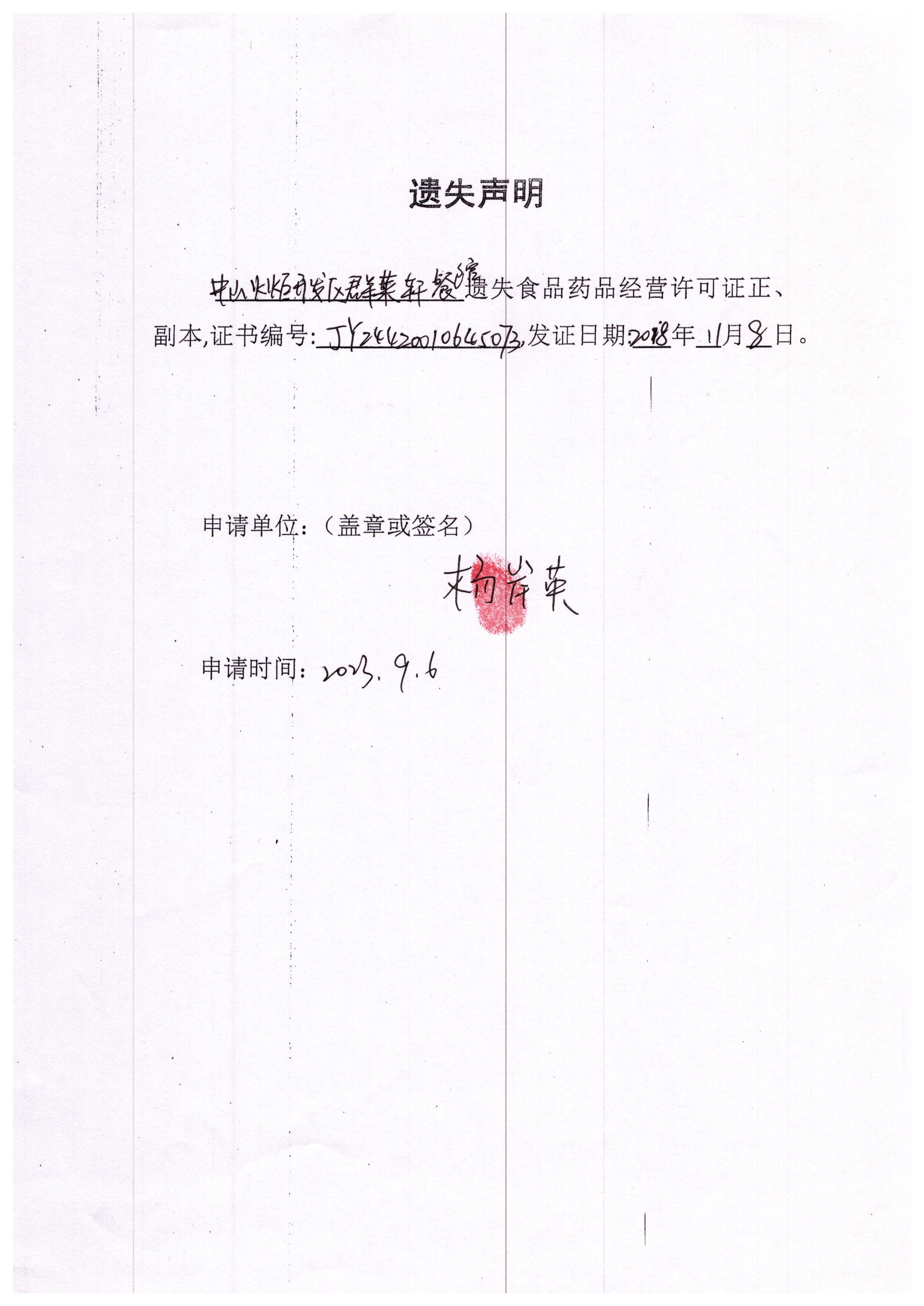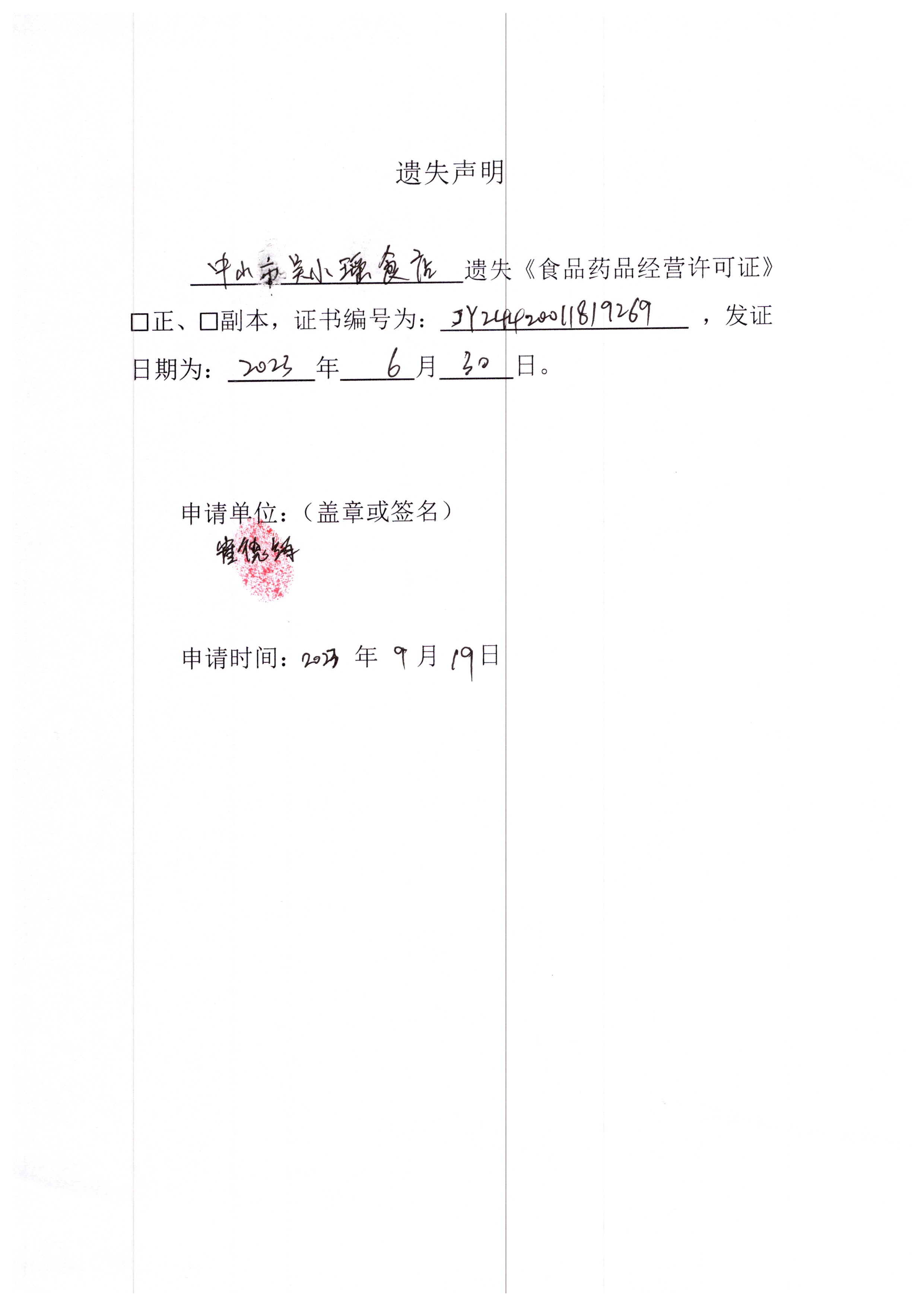 食品药品经营许可证遗失声明(中山火炬开发区群莱轩餐馆、中山市吴小瑶食店、中山市卓雅外国语学校)
