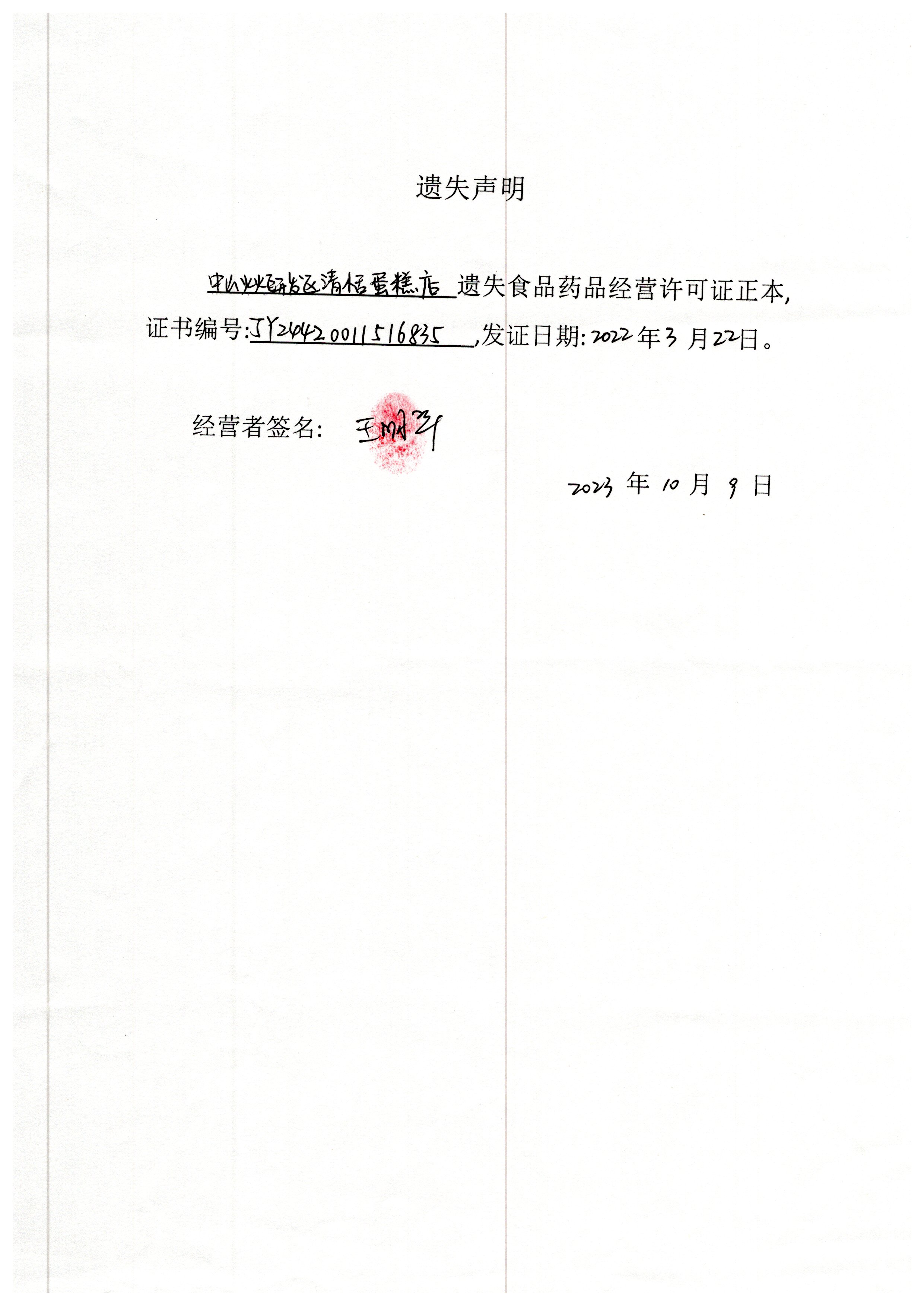 食品药品经营许可证遗失声明(中山火炬开发区魔豆咖啡屋、中山火炬开发区懂雨芝食店、中山火炬开发区清恬蛋糕店、中山火炬开发区关刀商店、中山火炬开发区宝文食品档)