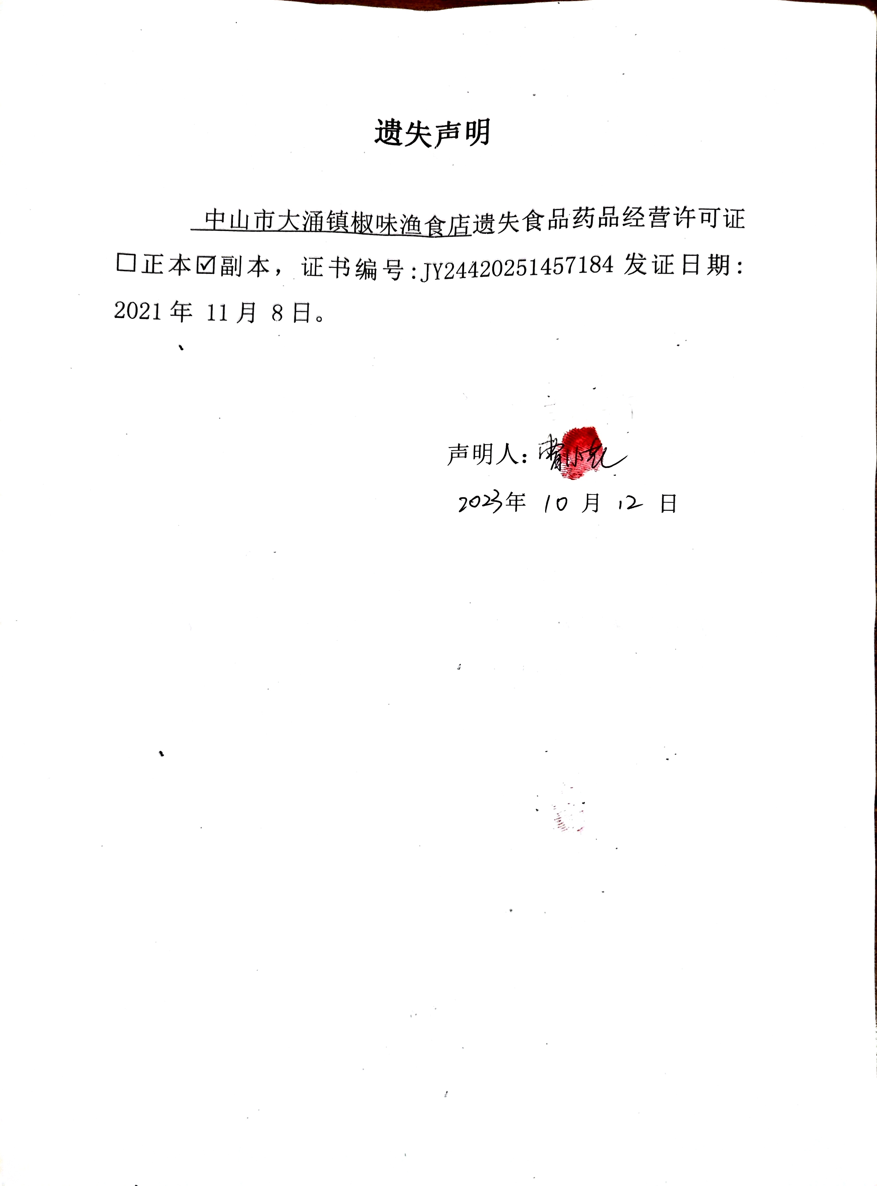食品药品经营许可证遗失声明(中山市大涌镇椒味渔食店)