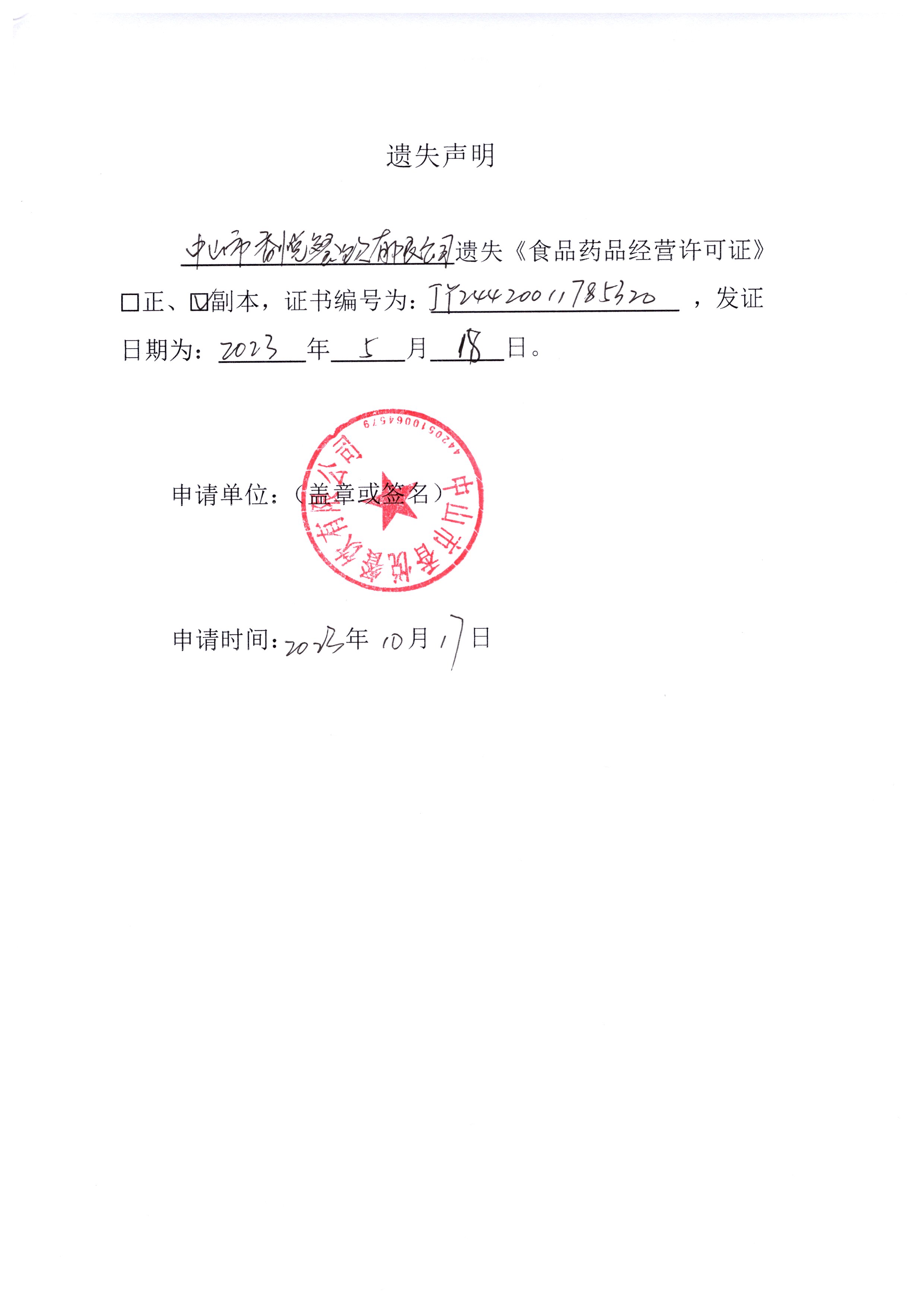 食品药品经营许可证遗失声明(中山市香悦餐饮有限公司)