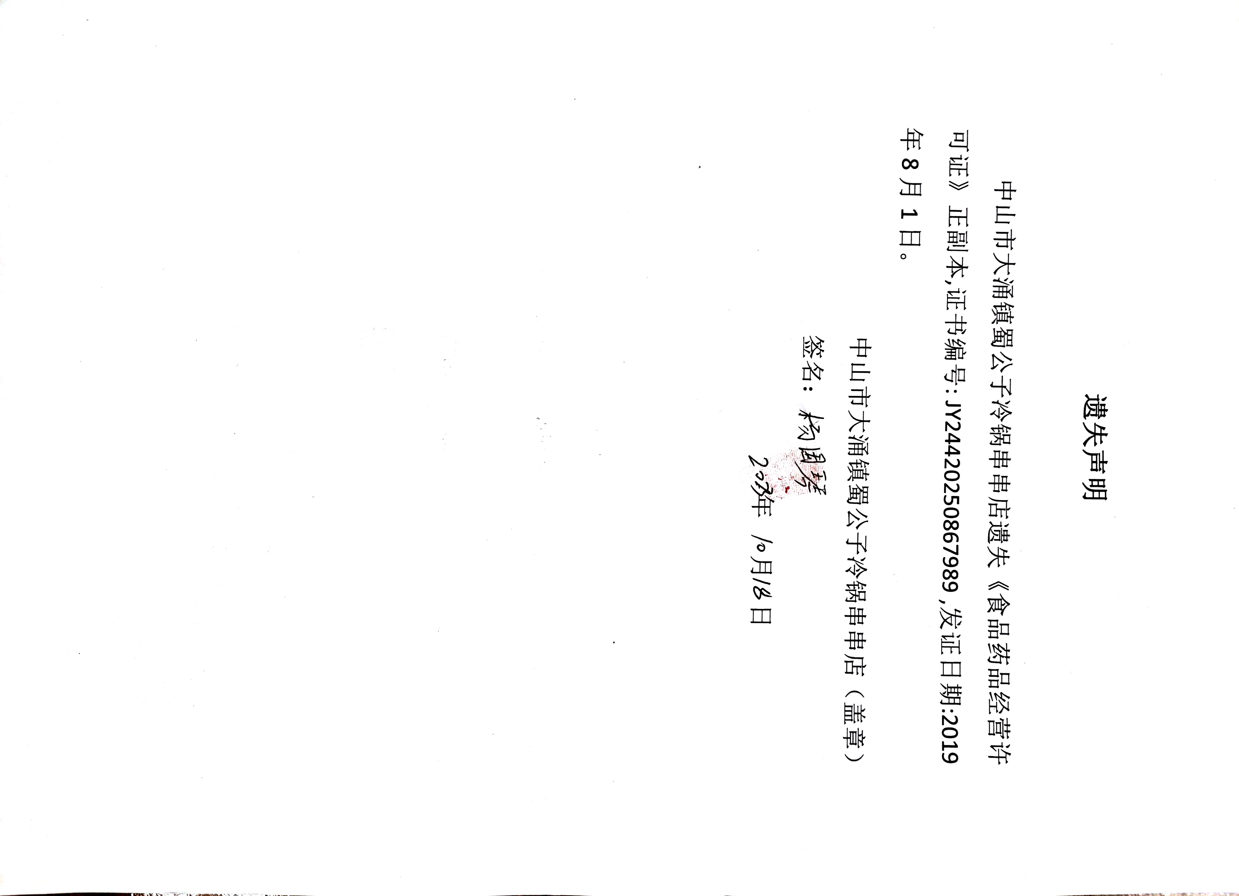 食品药品经营许可证遗失声明(中山市大涌镇蜀公子冷锅串串店)