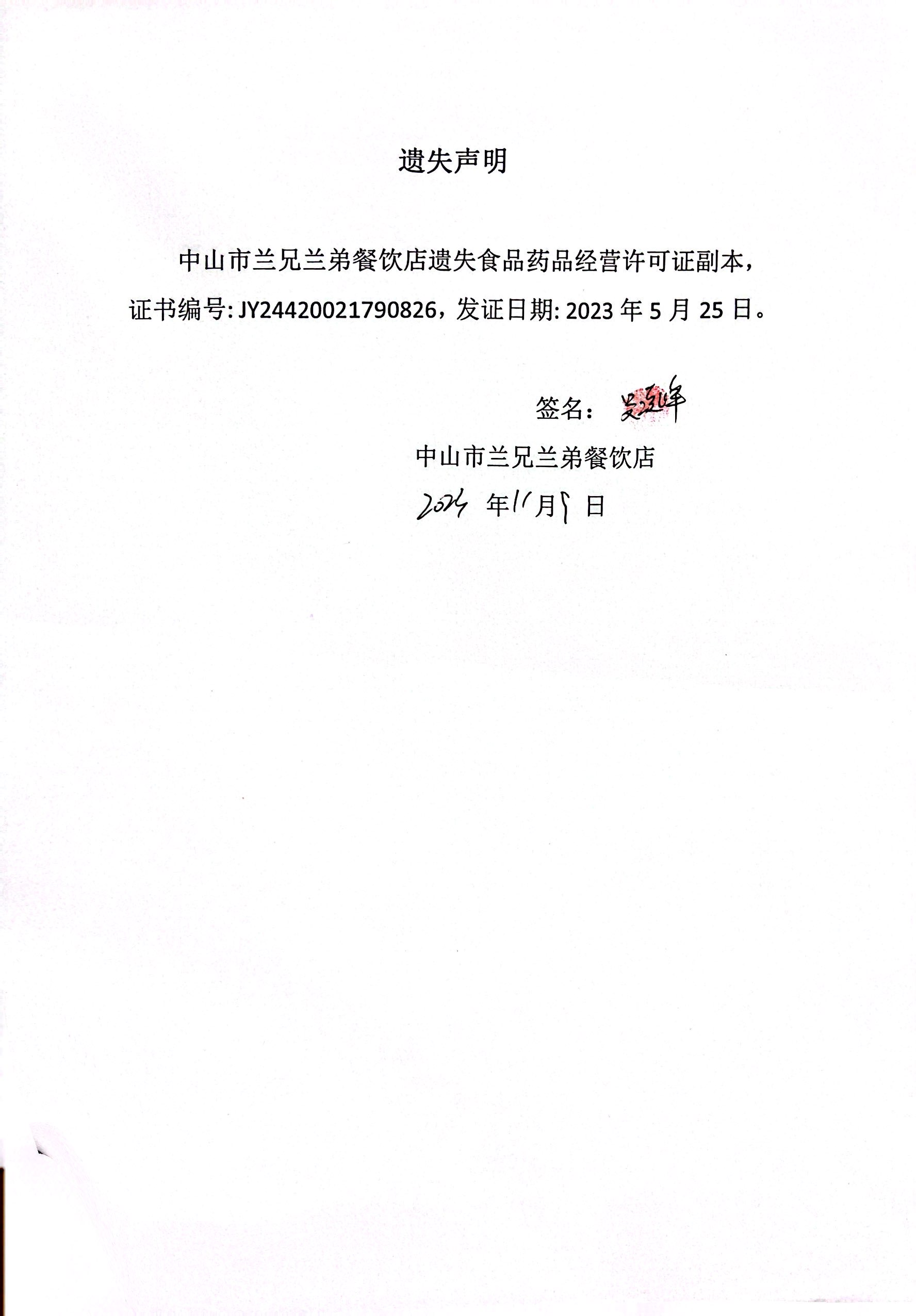 食品药品经营许可证遗失声明(中山市兰兄兰弟餐饮店)