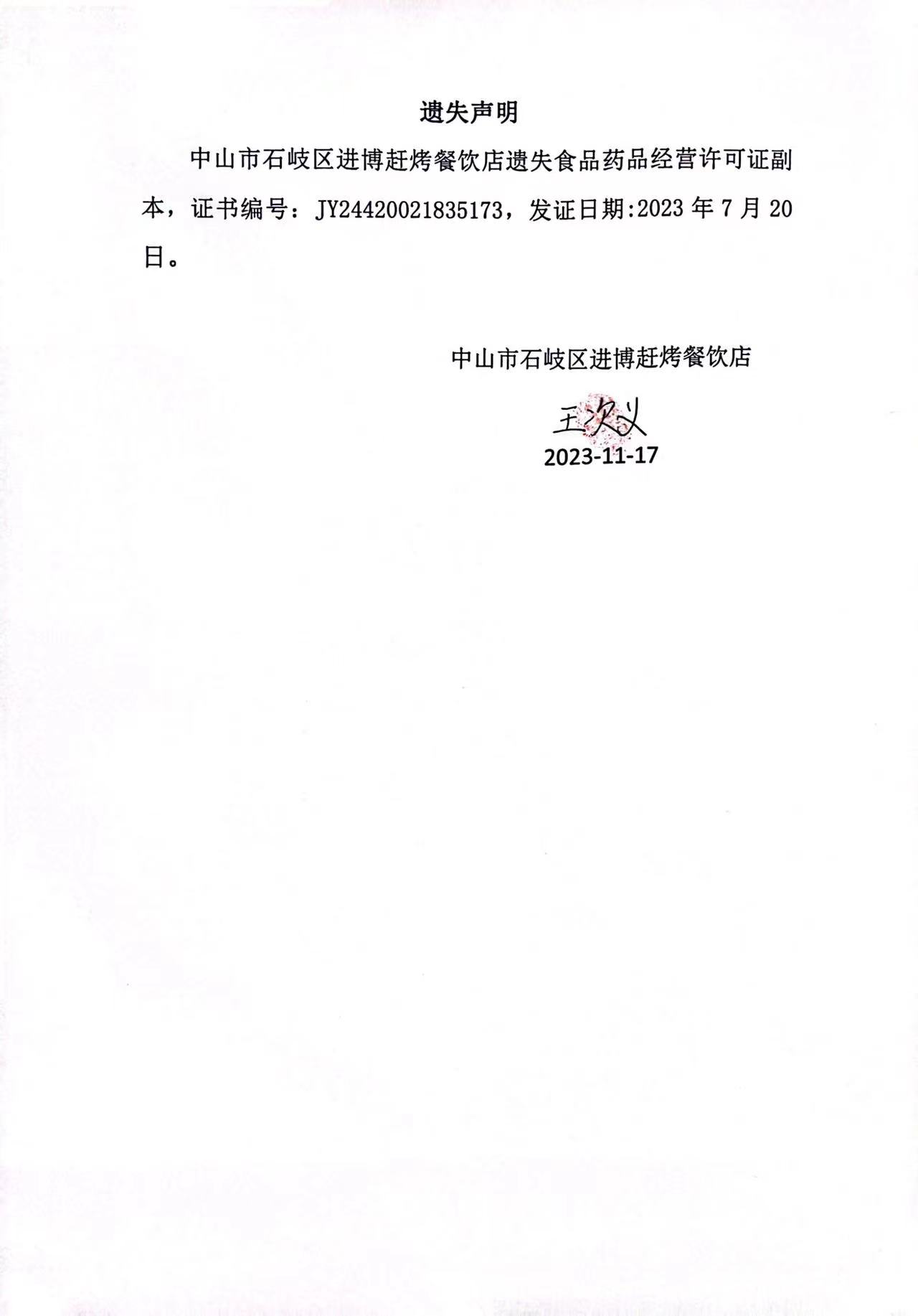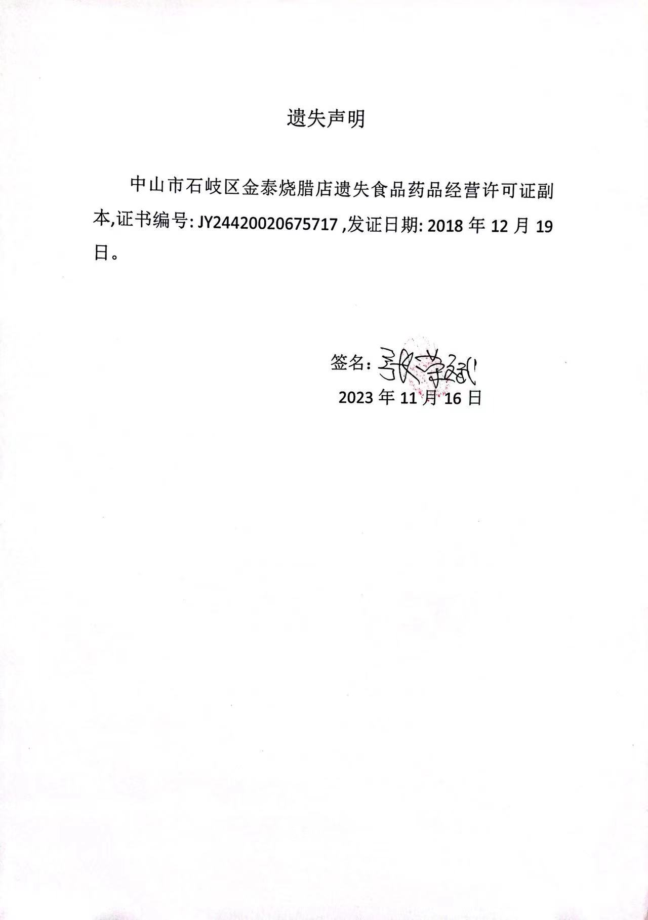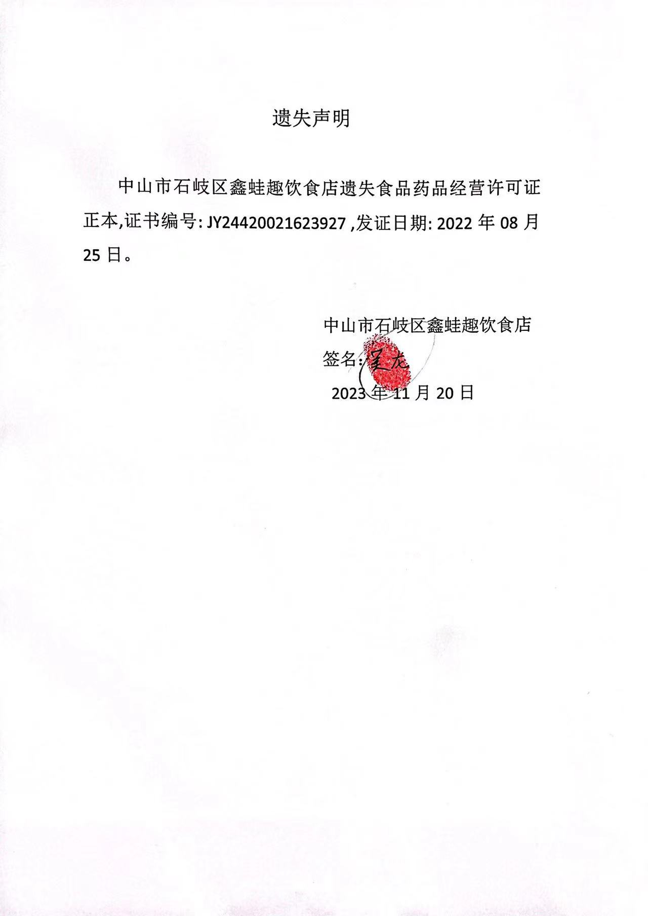 食品药品经营许可证遗失声明(中山市石岐区鑫蛙趣饮食店、中山市石岐区金泰烧腊店、中山市石岐区进博赶烤餐饮店)