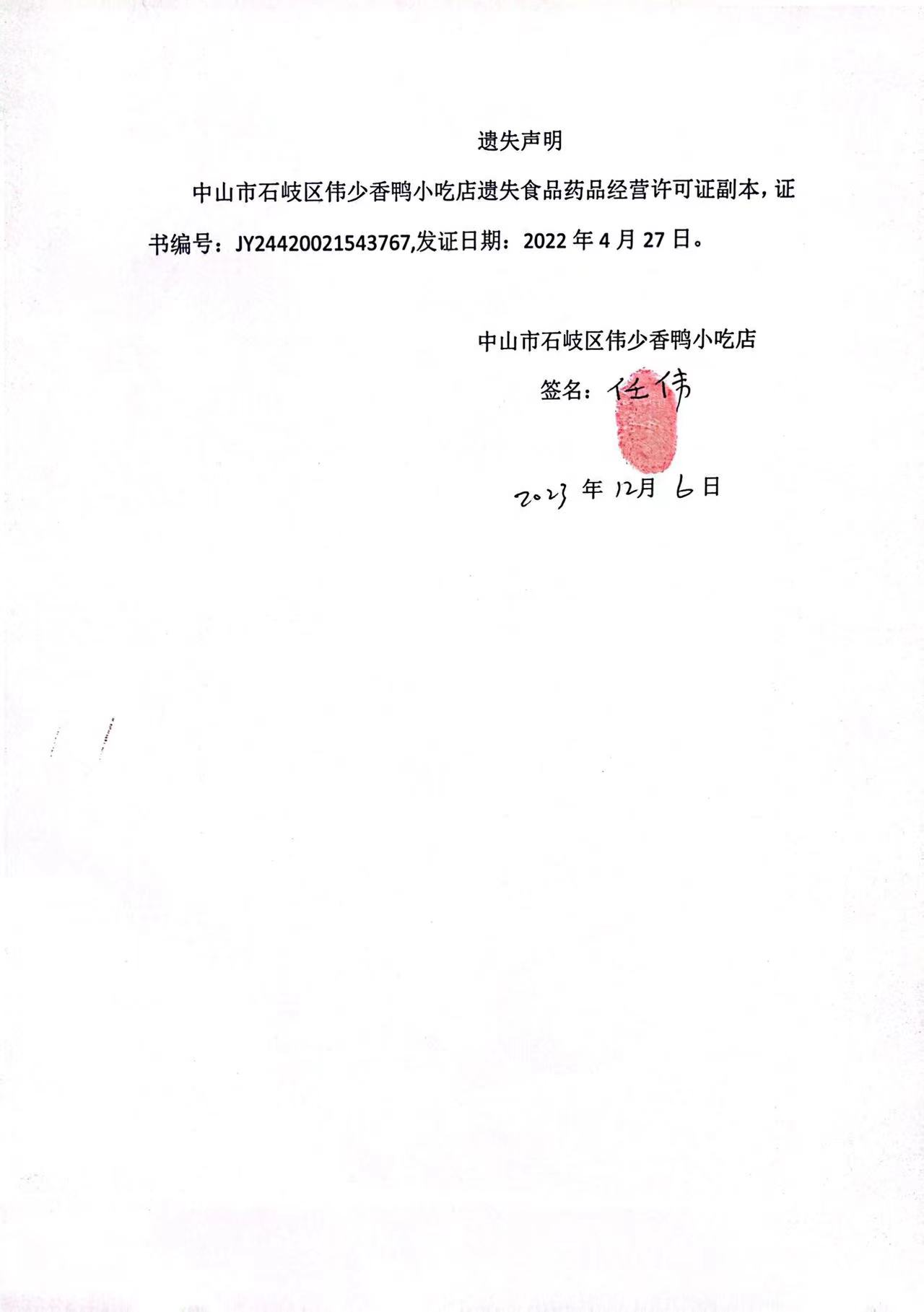 食品药品经营许可证遗失声明(中山市石岐区伟少香鸭小吃店)