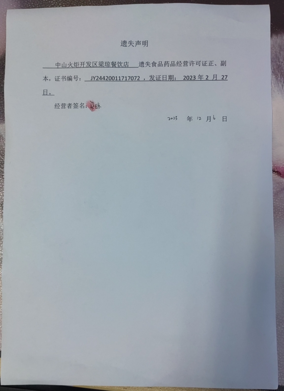 食品药品经营许可证遗失声明(中山火炬开发区鸿诚餐饮服务中心、中山火炬开发区程鸿香辣虾食店、中山火炬开发区梁琼餐饮店、中山火炬开发区创纬小食店)