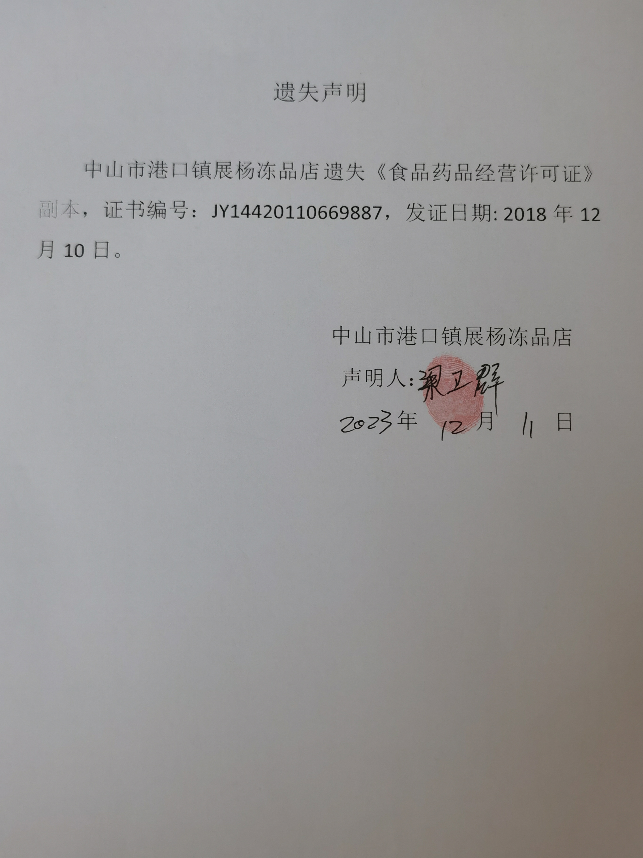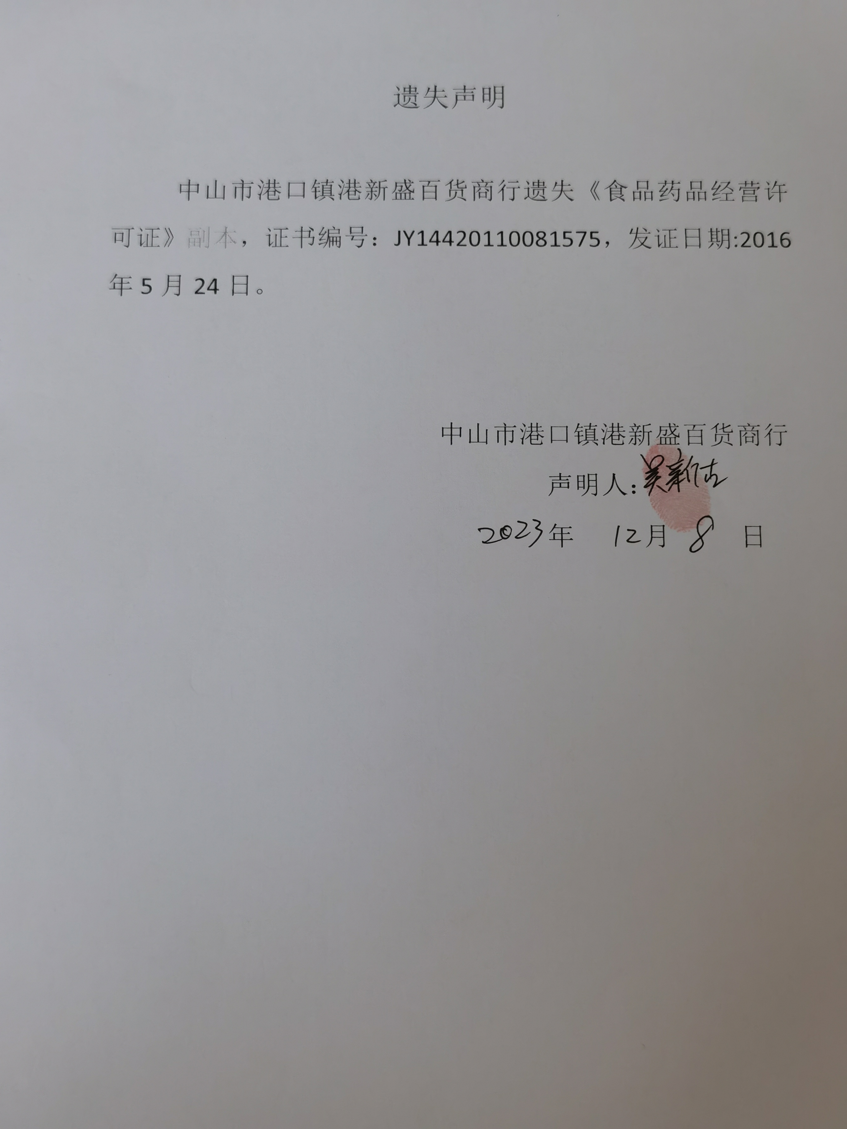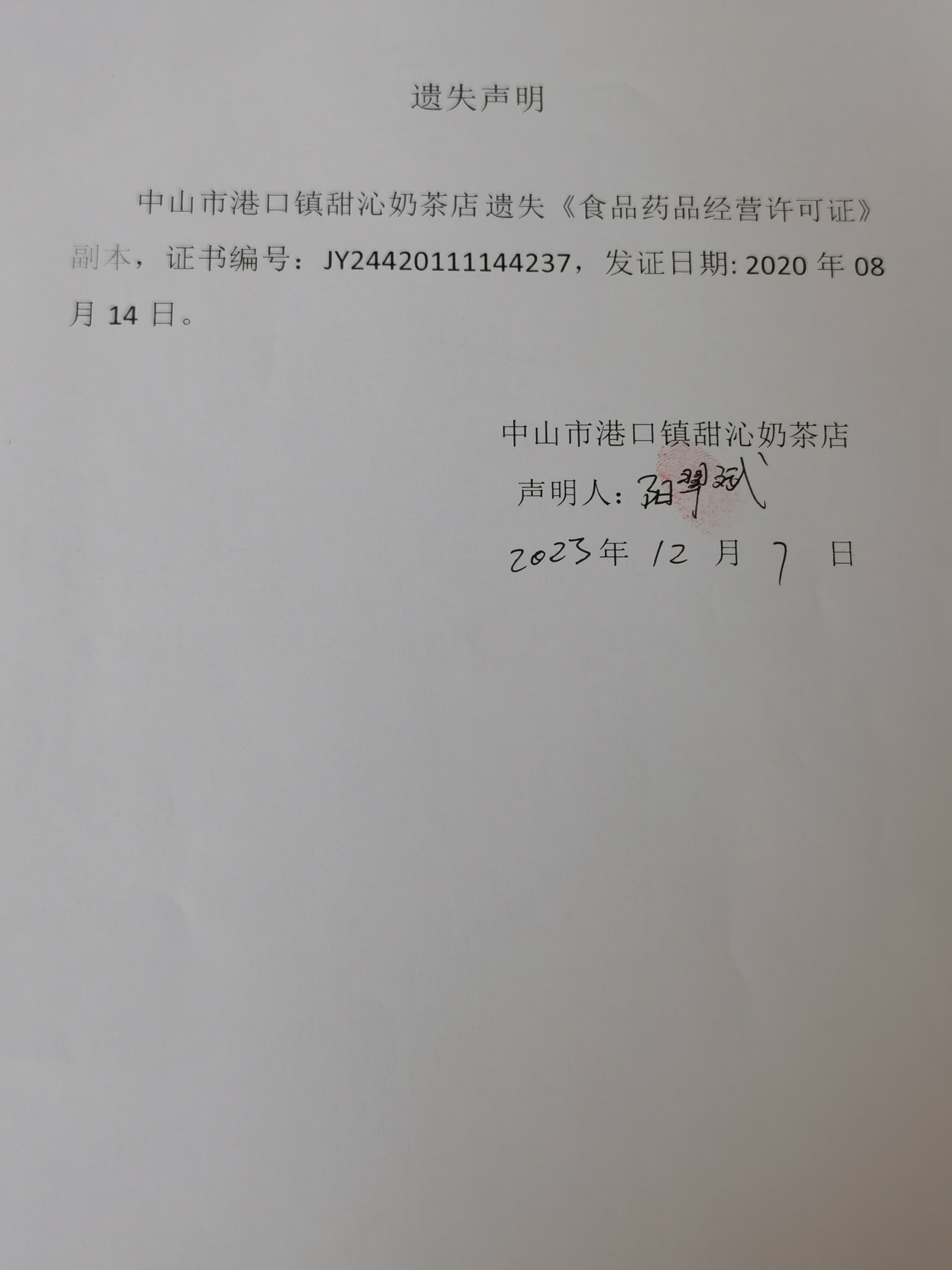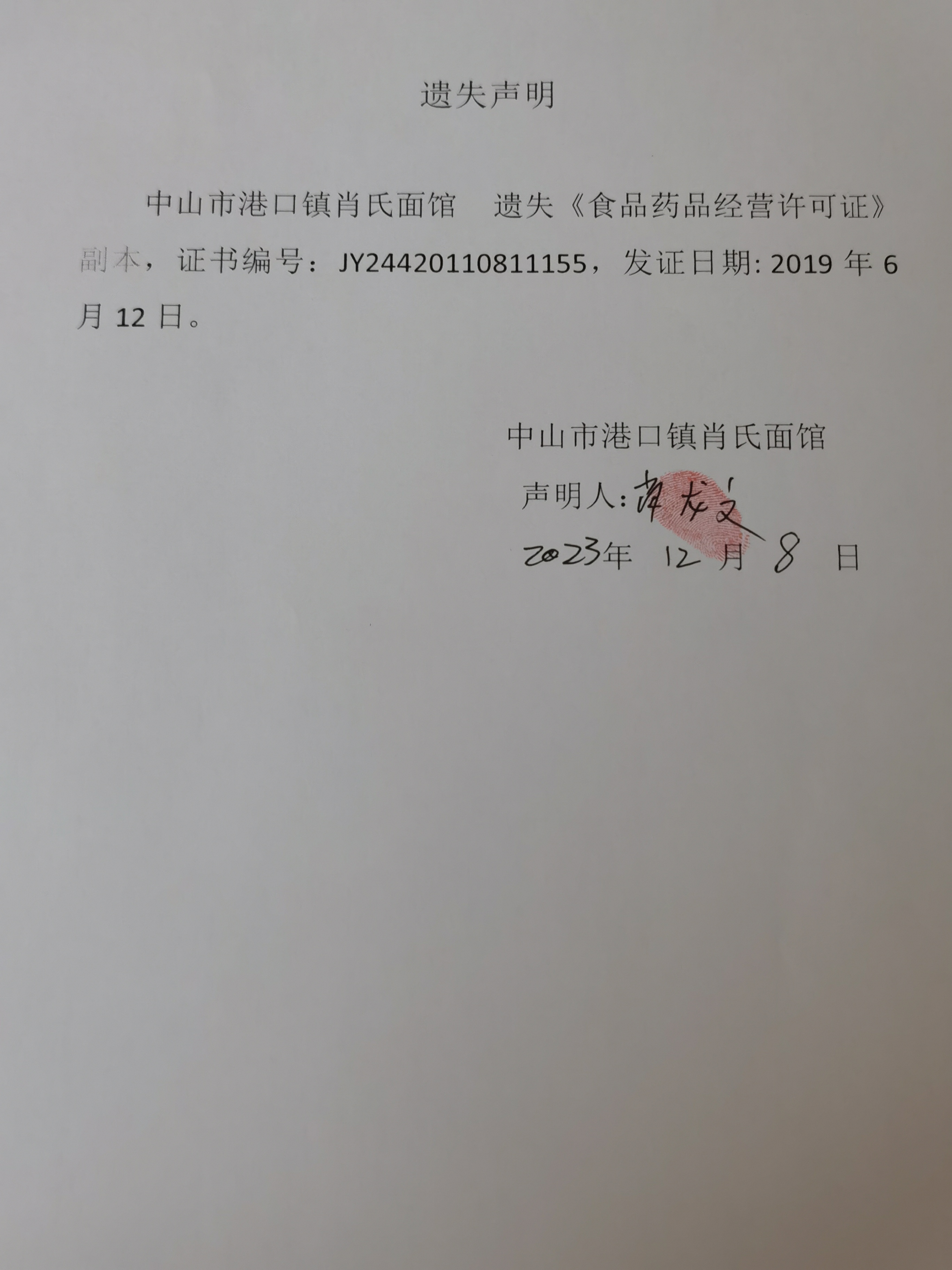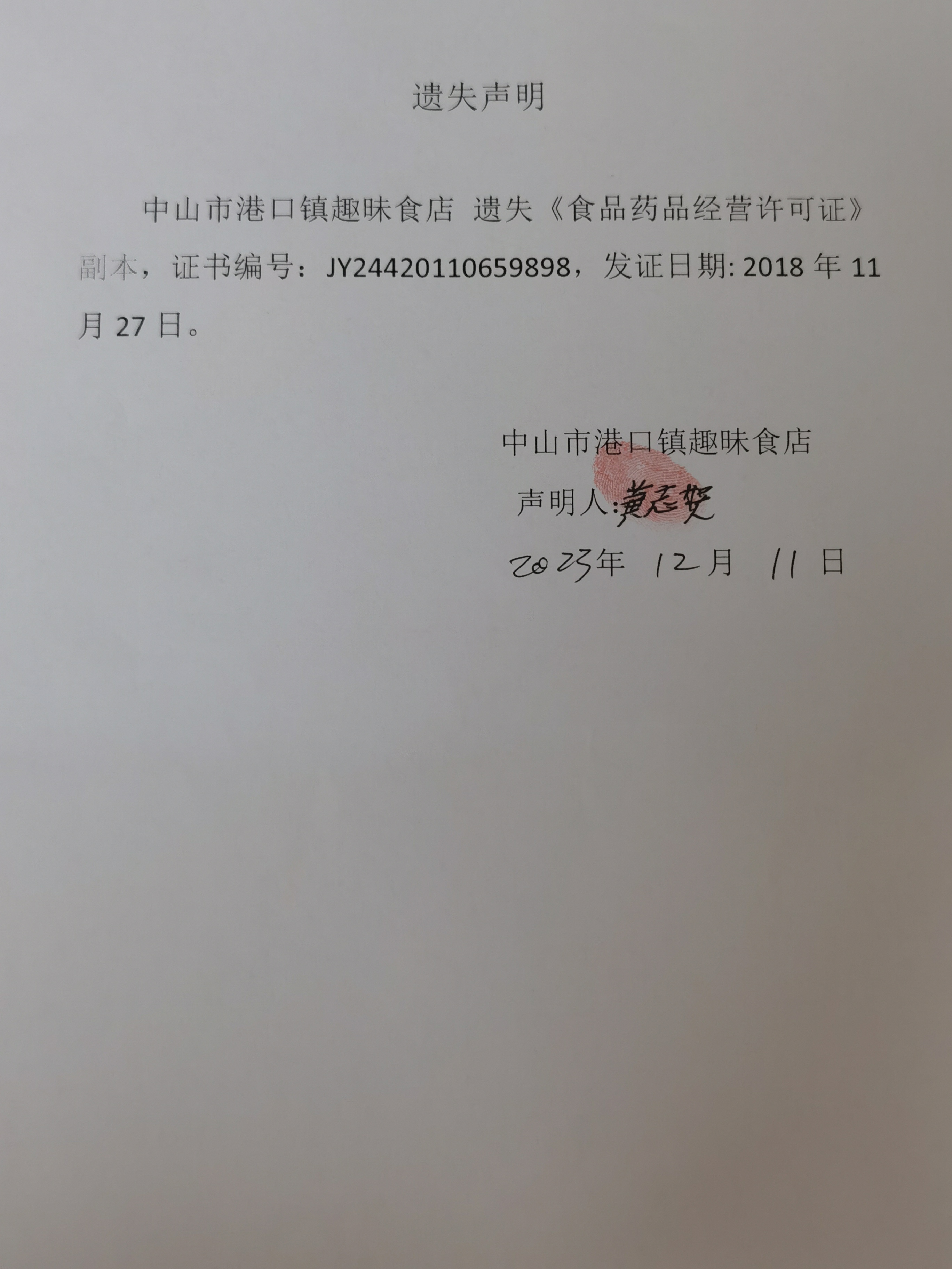 食品药品经营许可证遗失声明(中山市港口镇甜沁奶茶店、中山市港口镇肖氏面馆、中山市港口镇趣昧食店、中山市港口镇港新盛百货商行、中山市港口镇展杨冻品店)