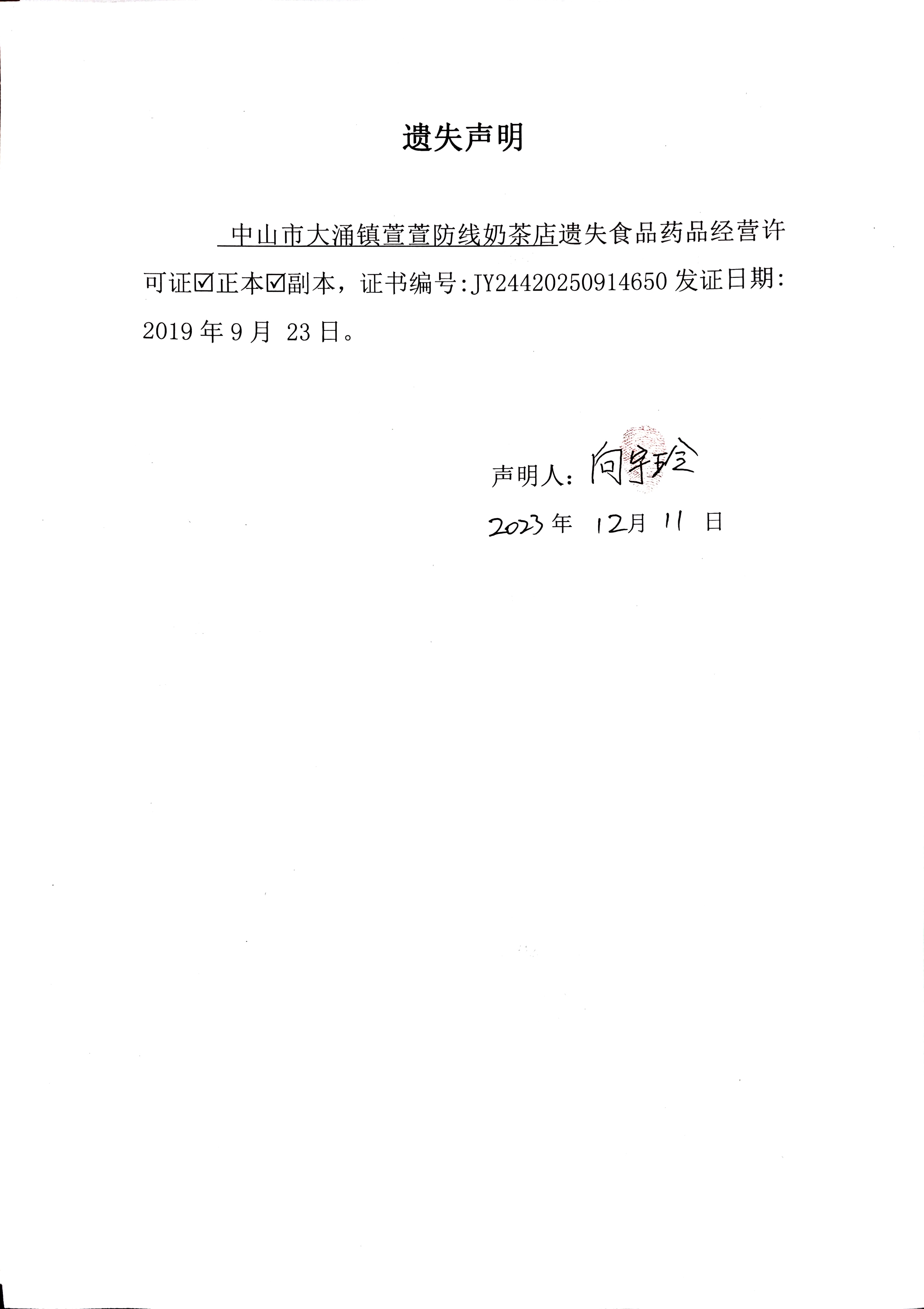 食品药品经营许可遗失声明(中山市大涌镇萱萱防线奶茶店)