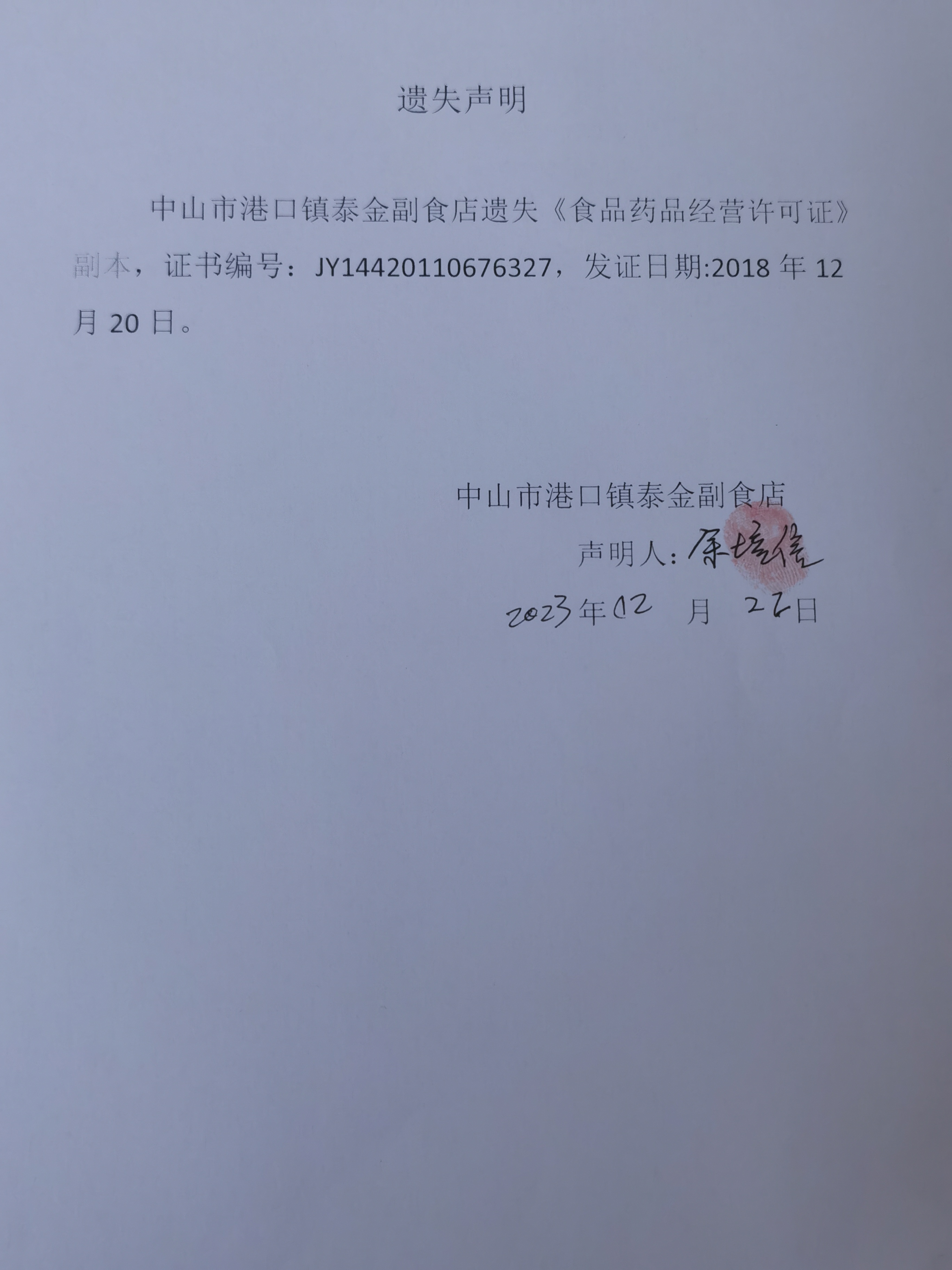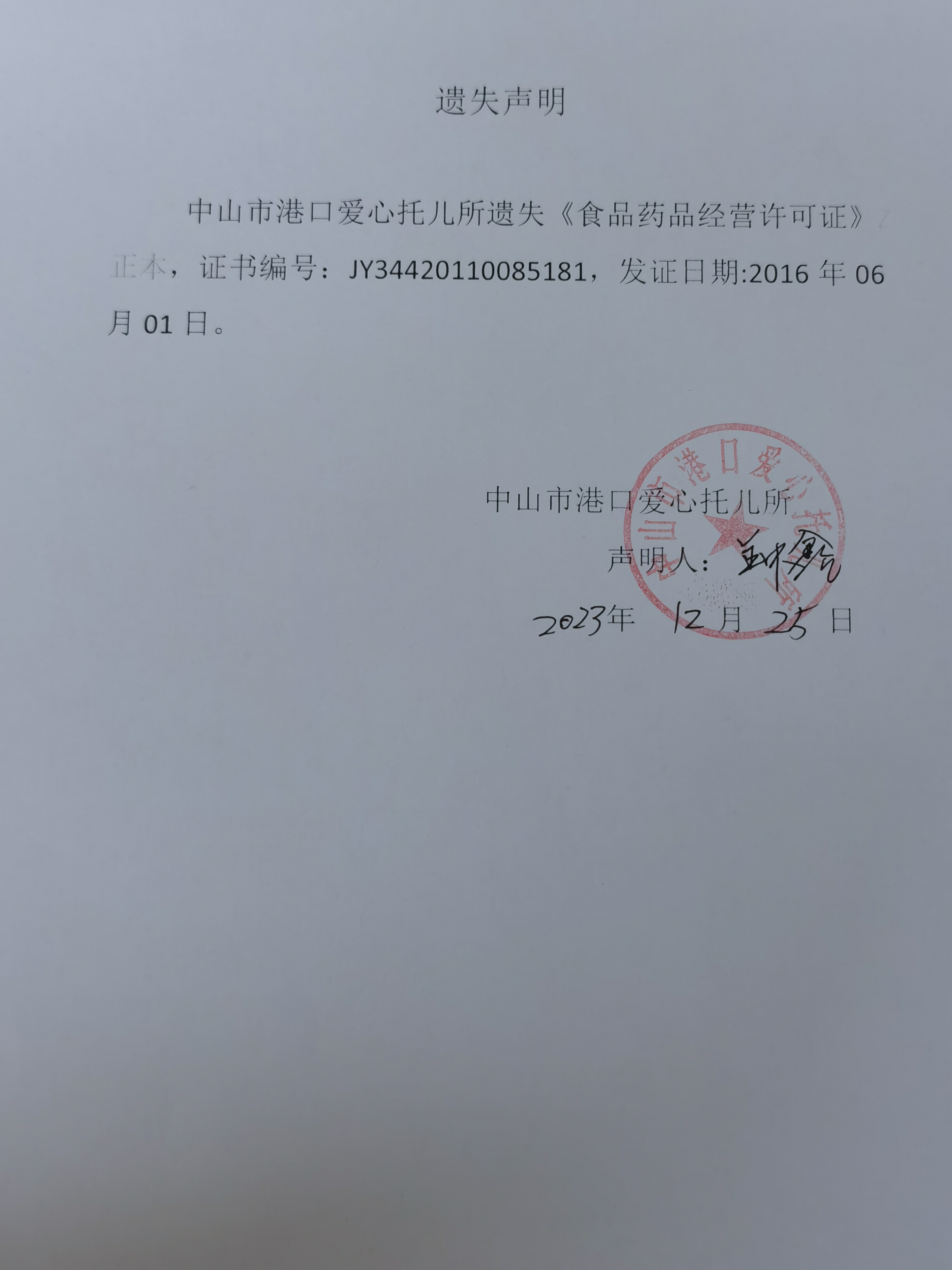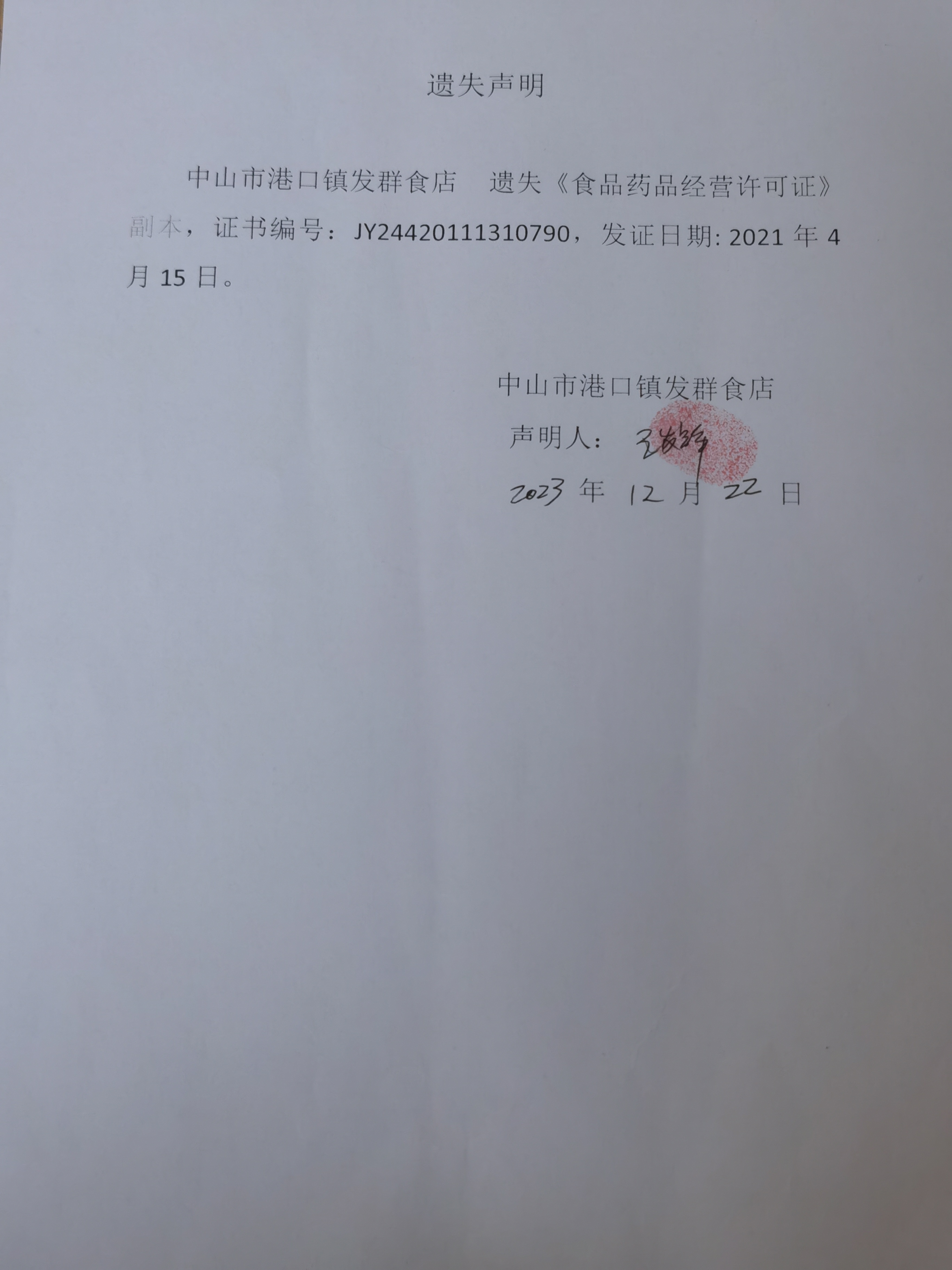 食品药品经营许可证遗失声明(中山市港口镇发群食店、中山市港口镇泰金副食店、中山市港口爱心托儿所)
