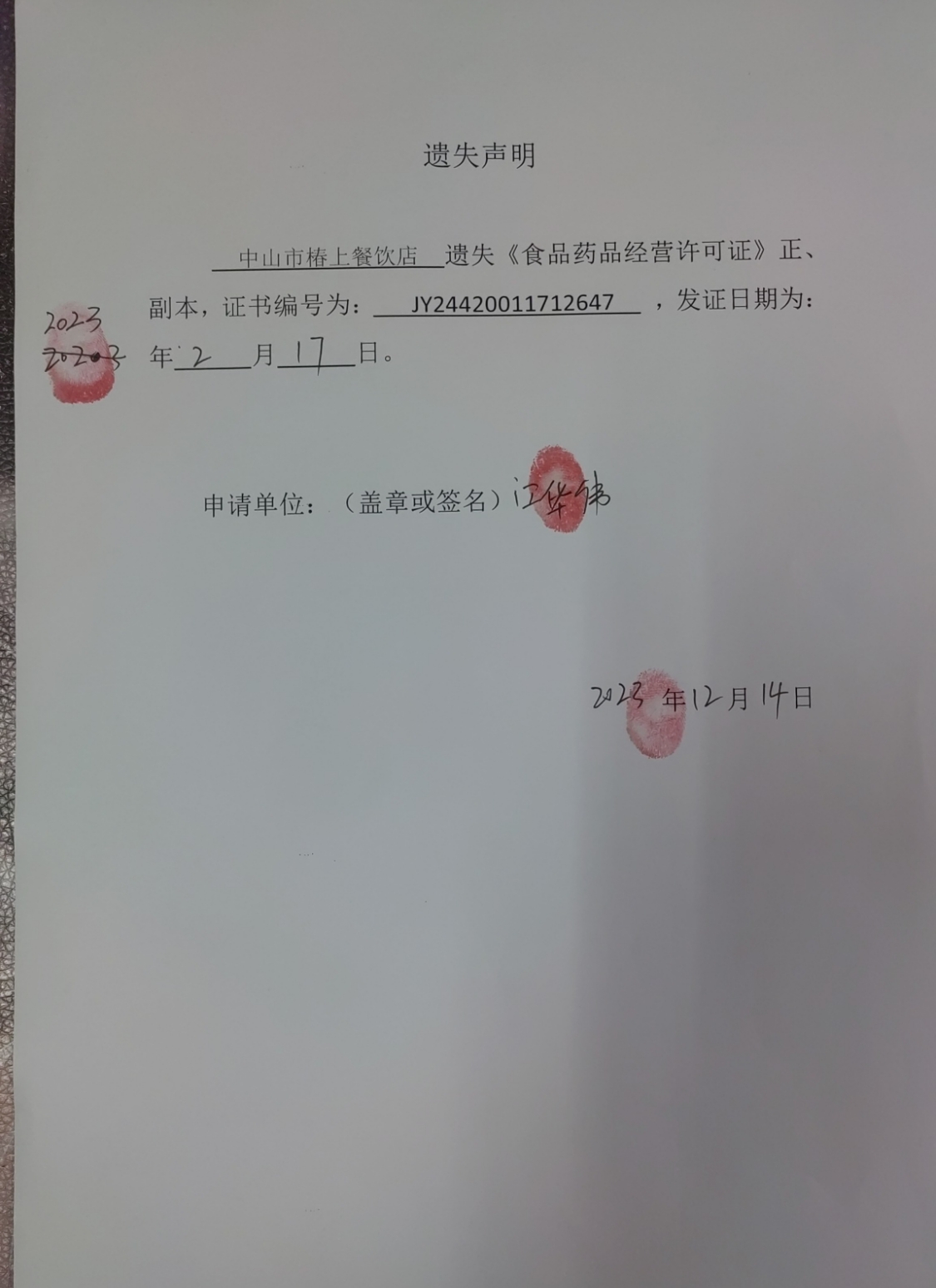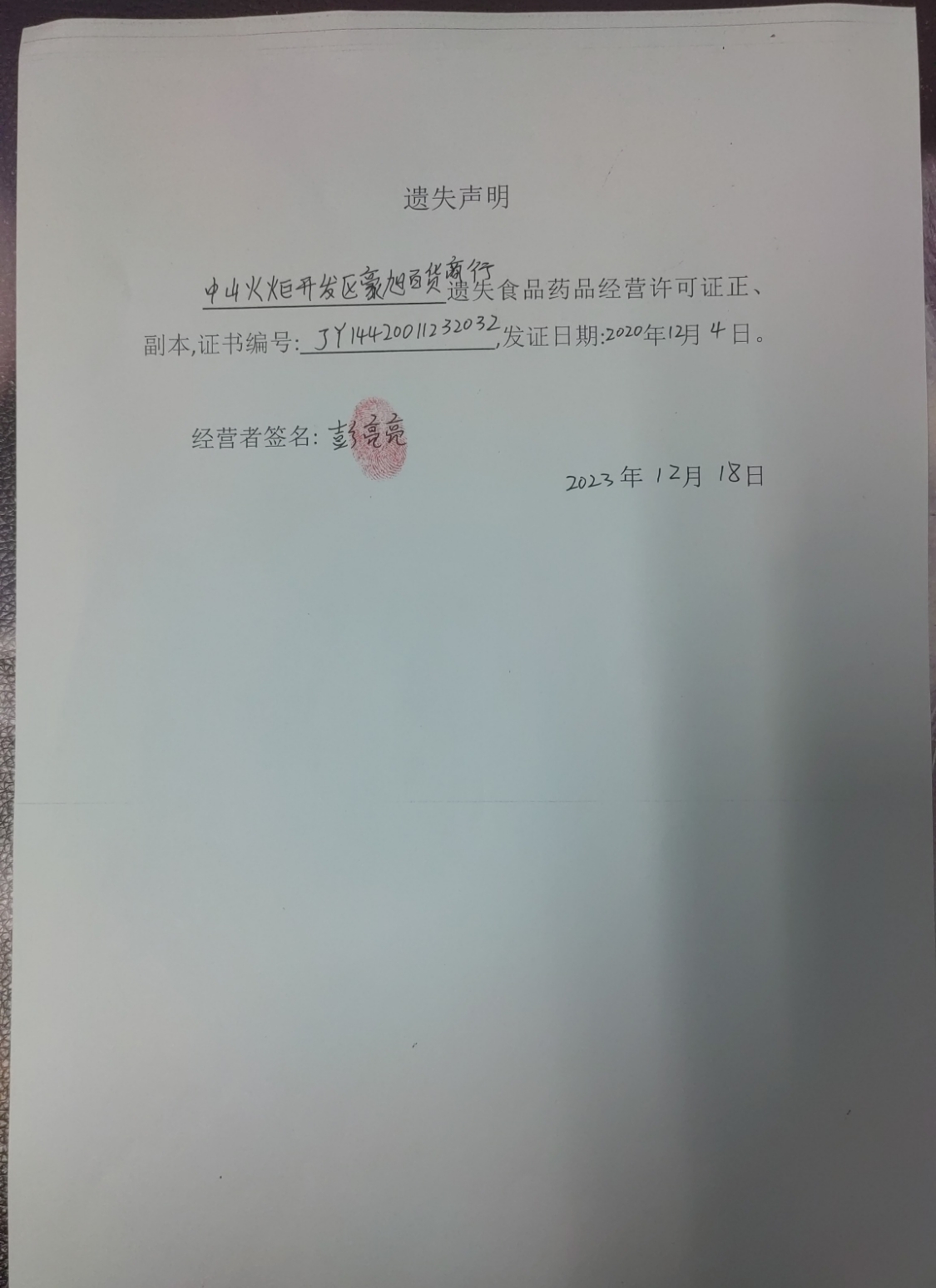 食品药品经营许可证遗失声明(中山火炬开发区豪旭百货商行、中山市椿上餐饮店)