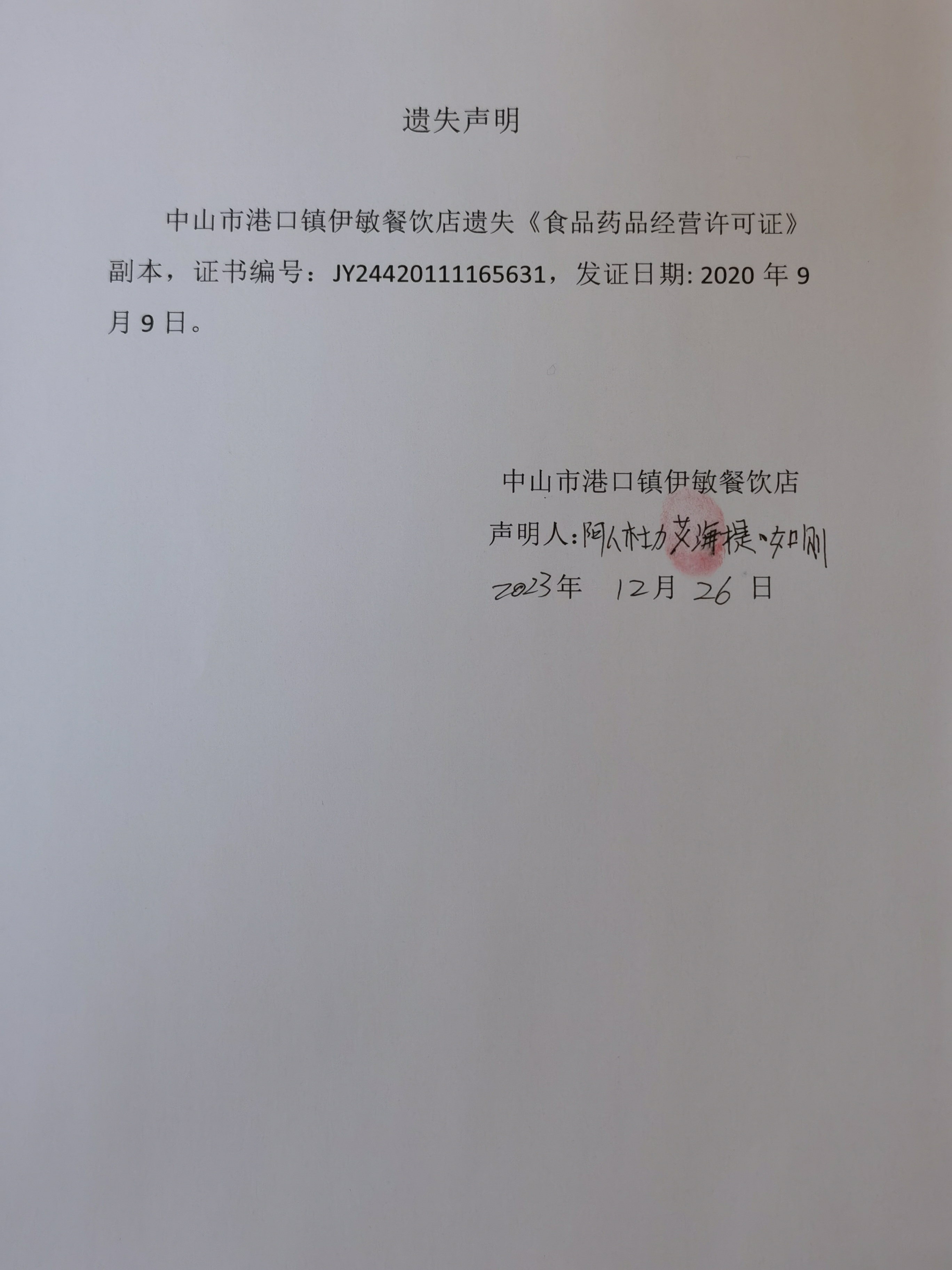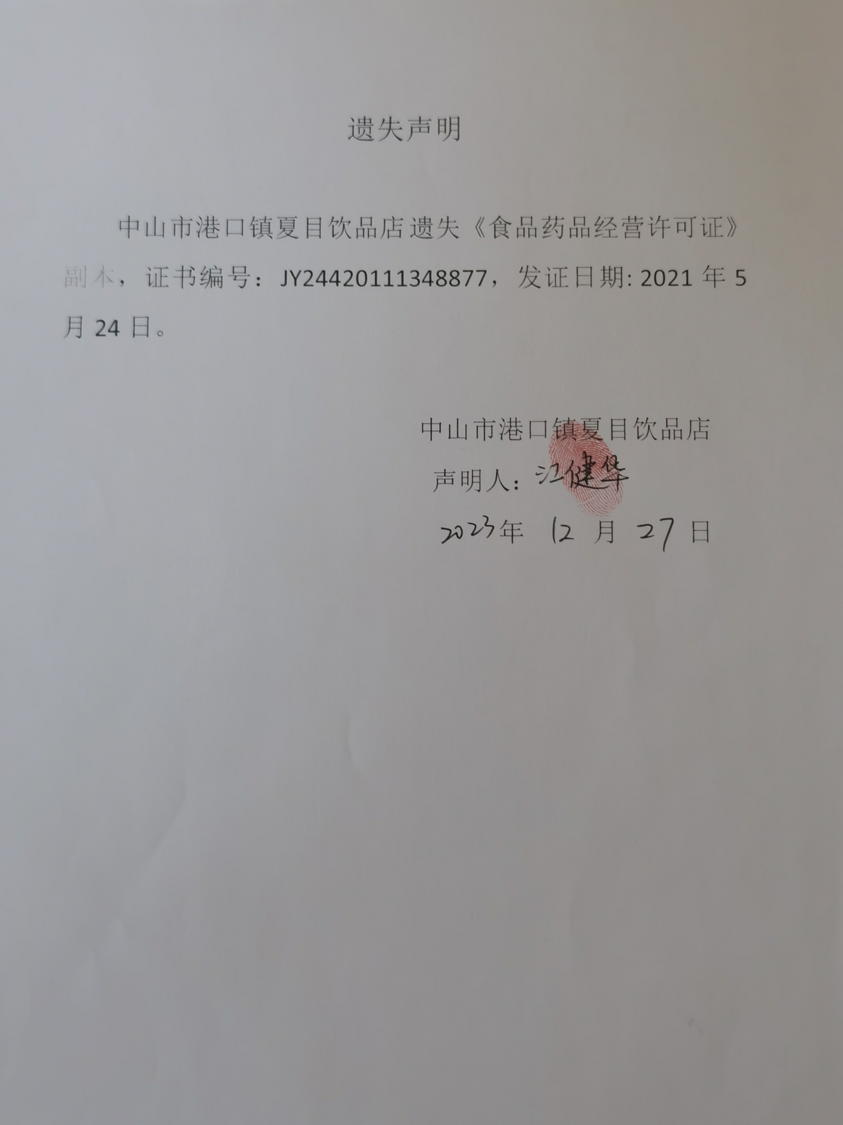 食品药品经营许可证遗失声明(中山市港口镇夏目饮品店、中山市港口镇伊敏餐饮店)