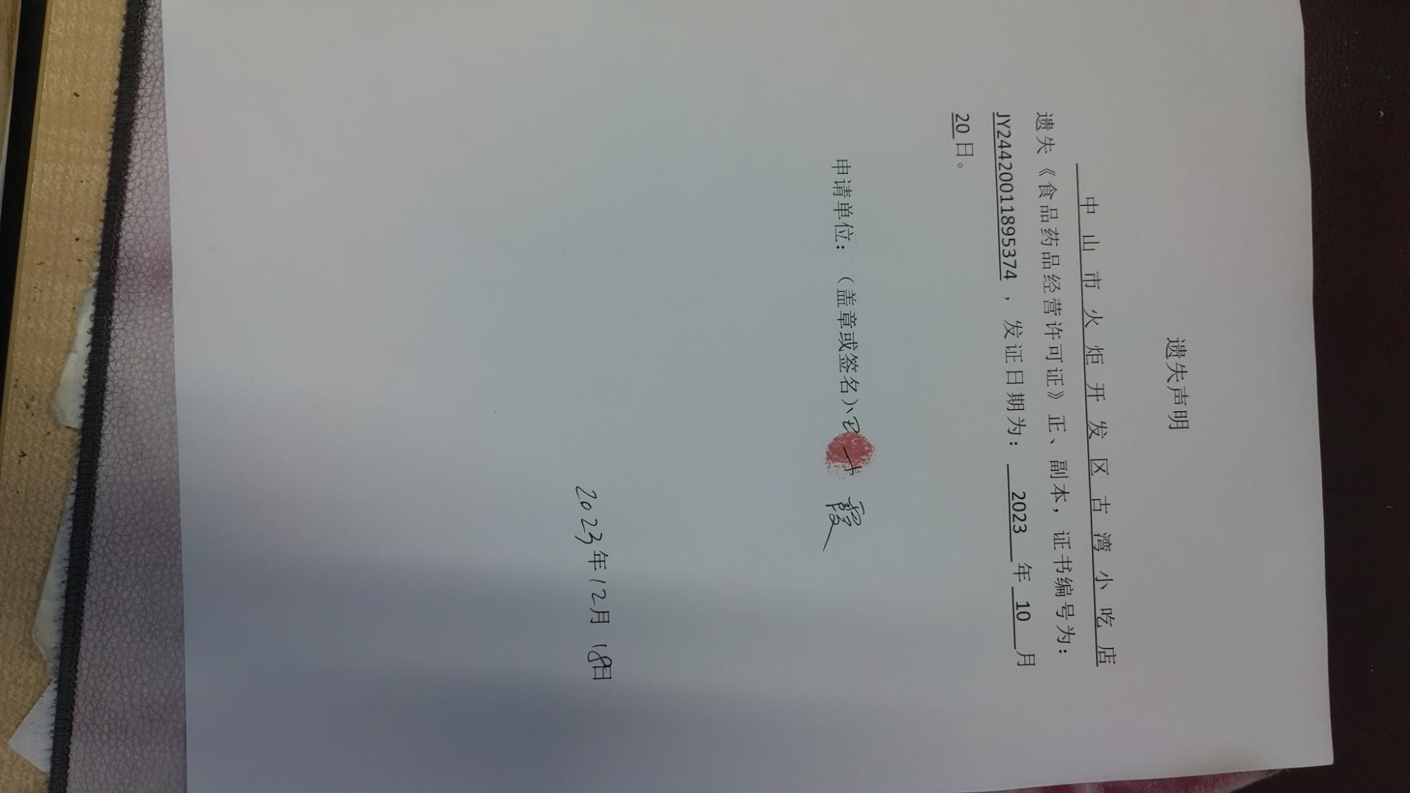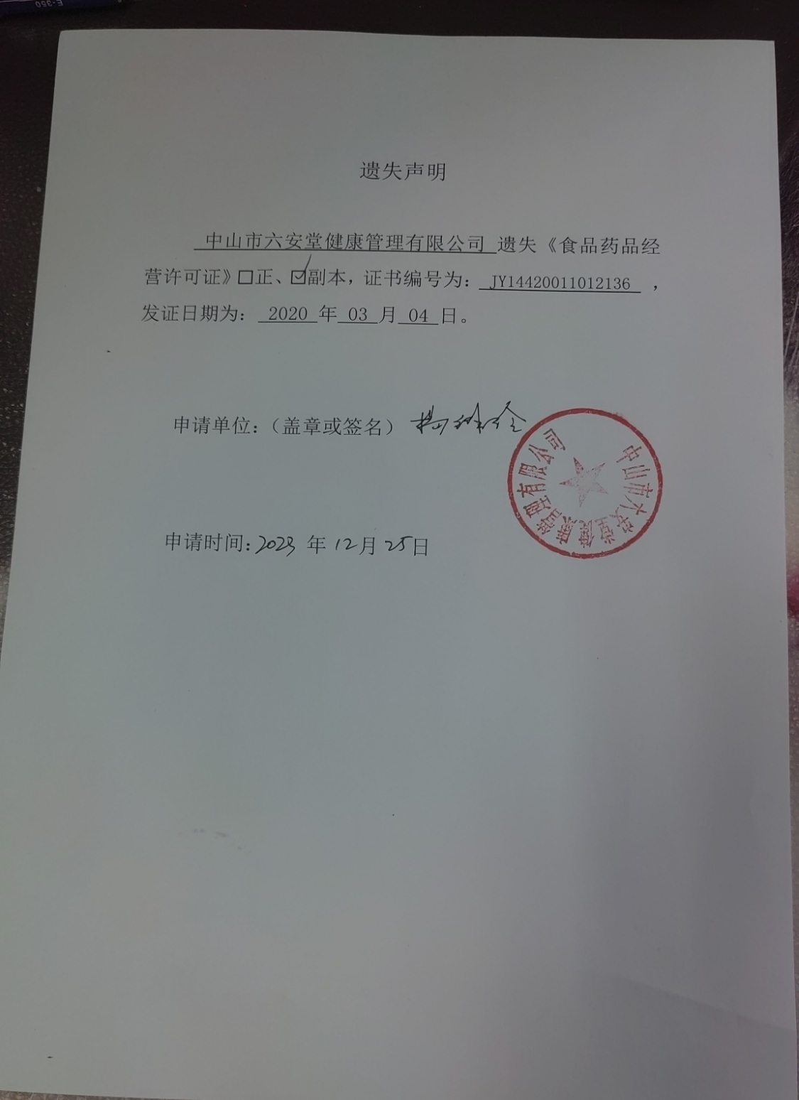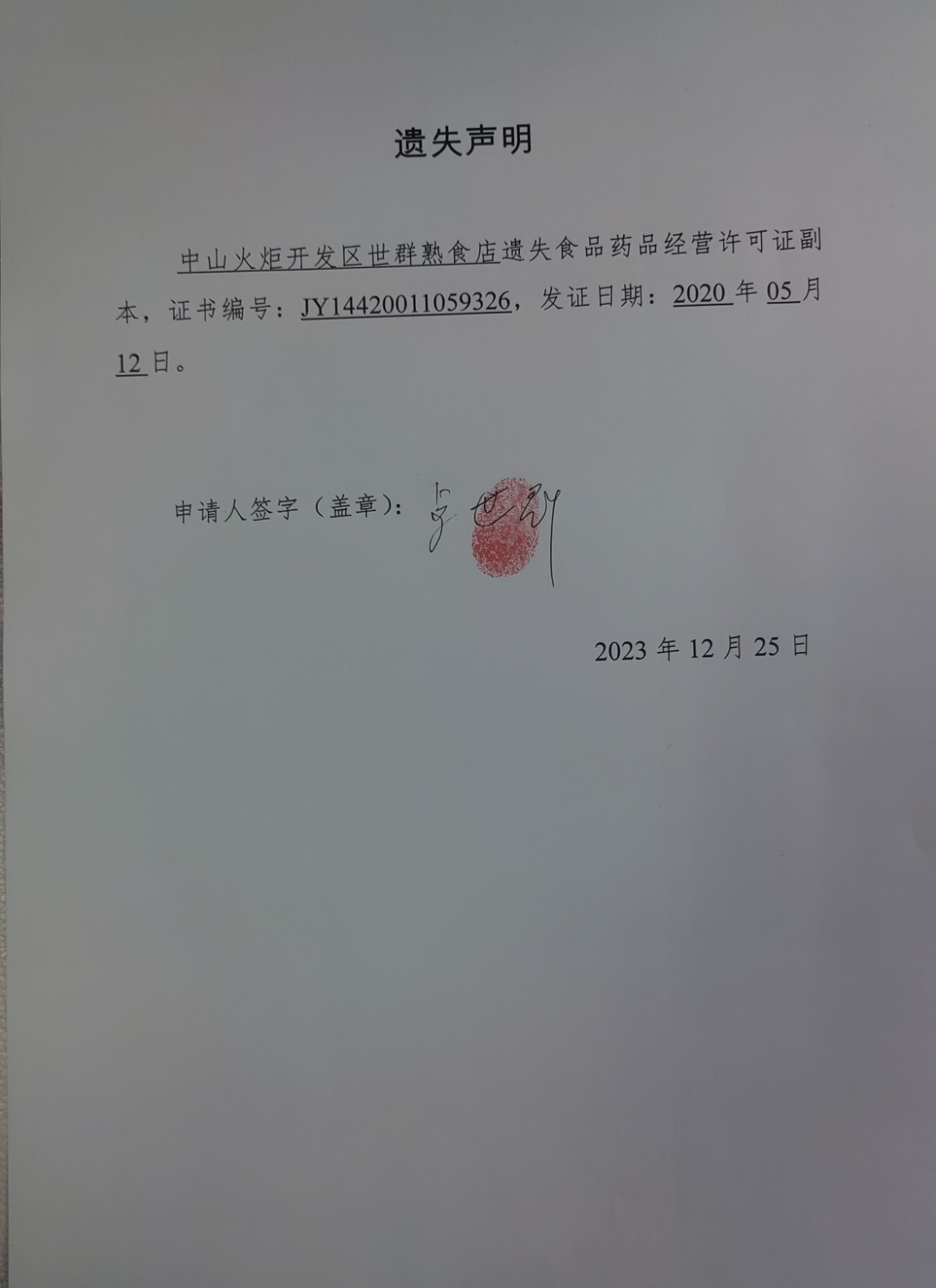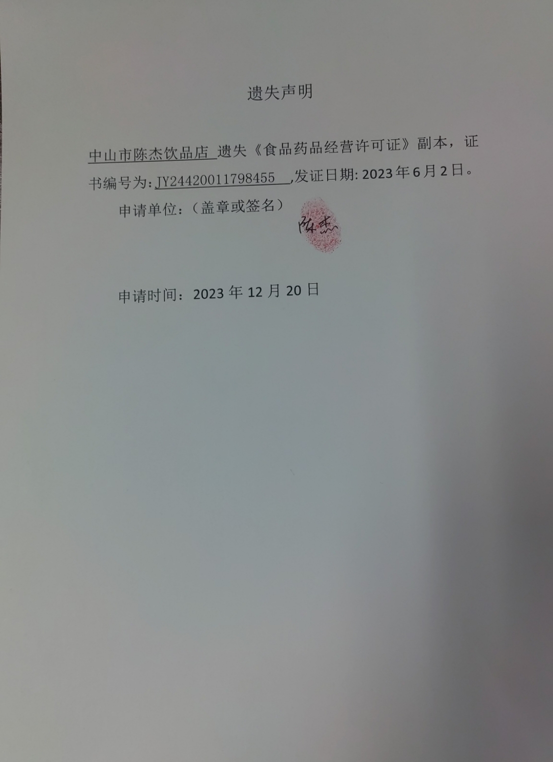 食品药品经营许可证遗失声明(中山市陈杰饮品店、中山火炬开发区世群熟食店、中山市火炬开发区鸿楠食品商行、中山市六安堂健康管理有限公司、中山市火炬开发区古湾小吃店)