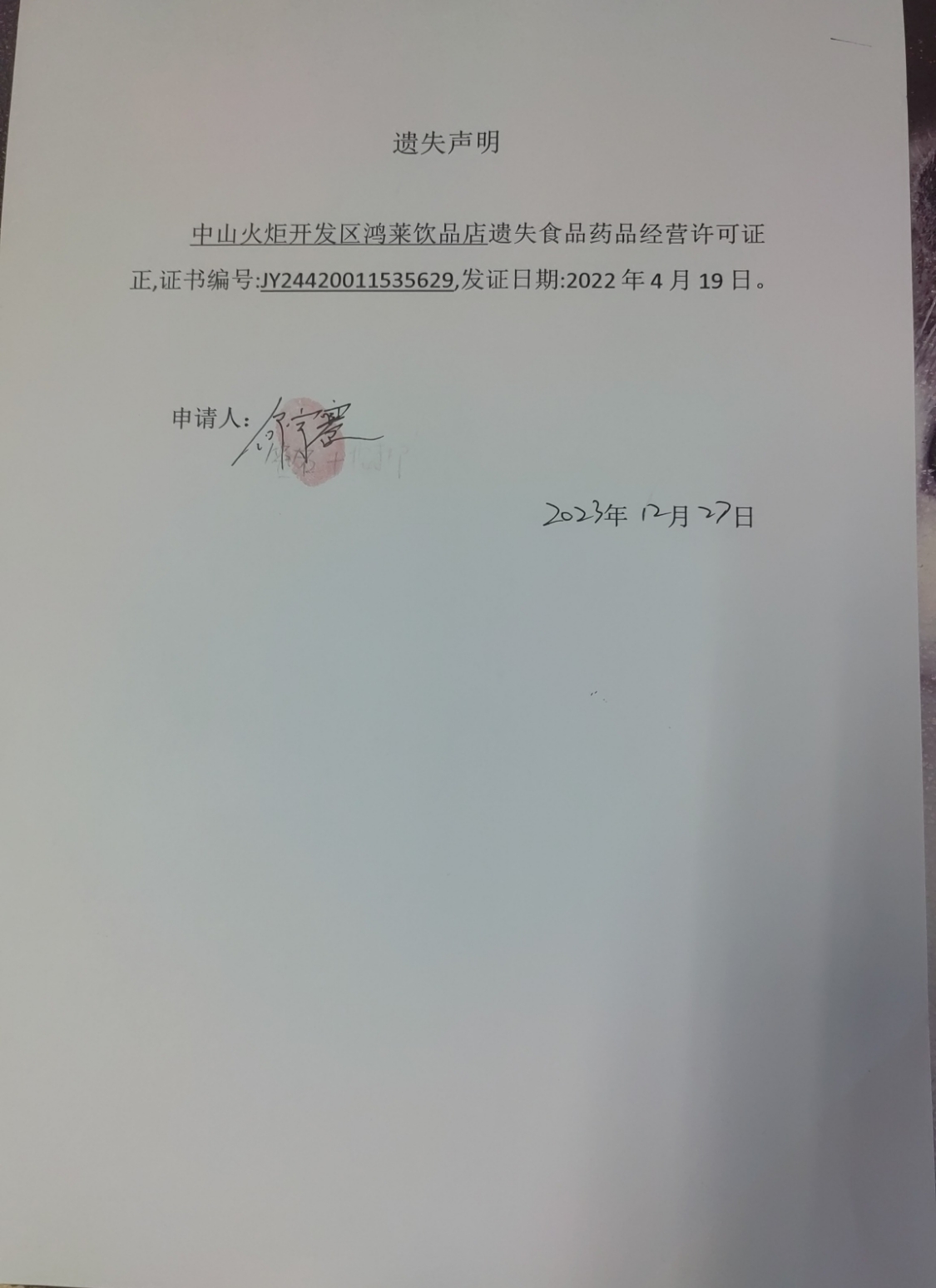 食品药品经营许可证遗失声明(中山火炬开发区鸿莱饮品店)