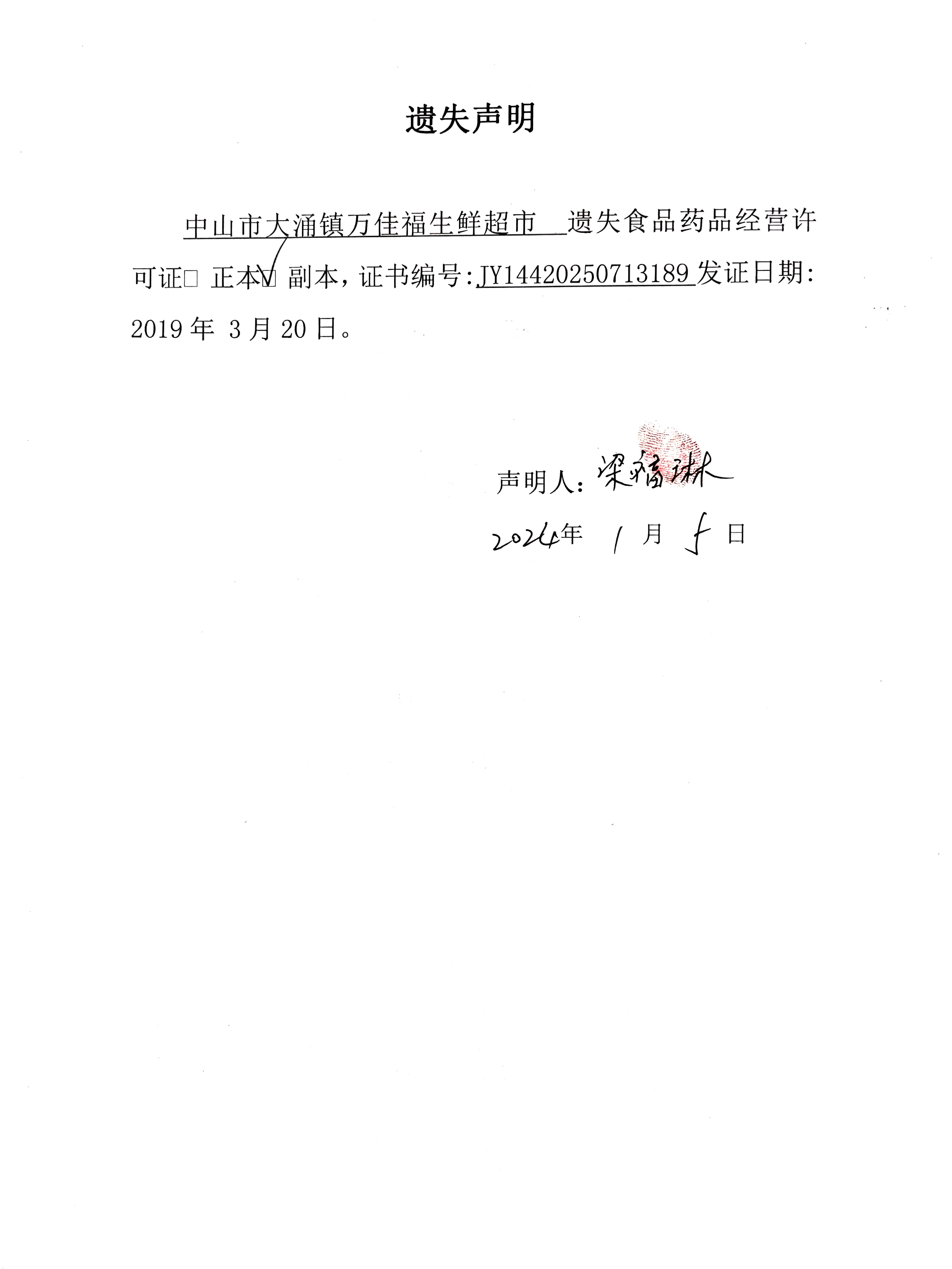 食品药品经营许可遗失声明(中山市大涌镇万佳福生鲜超市)