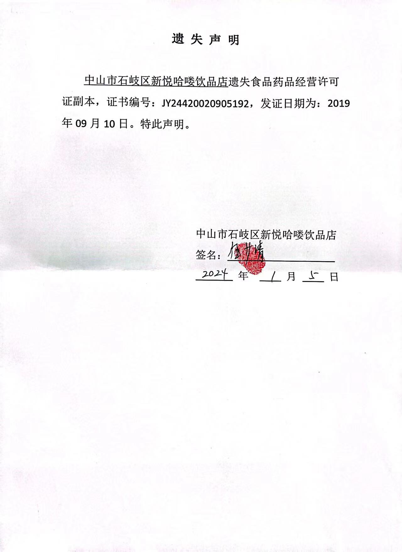 食品药品经营许可证遗失声明(中山市石岐区新悦哈喽饮品店)