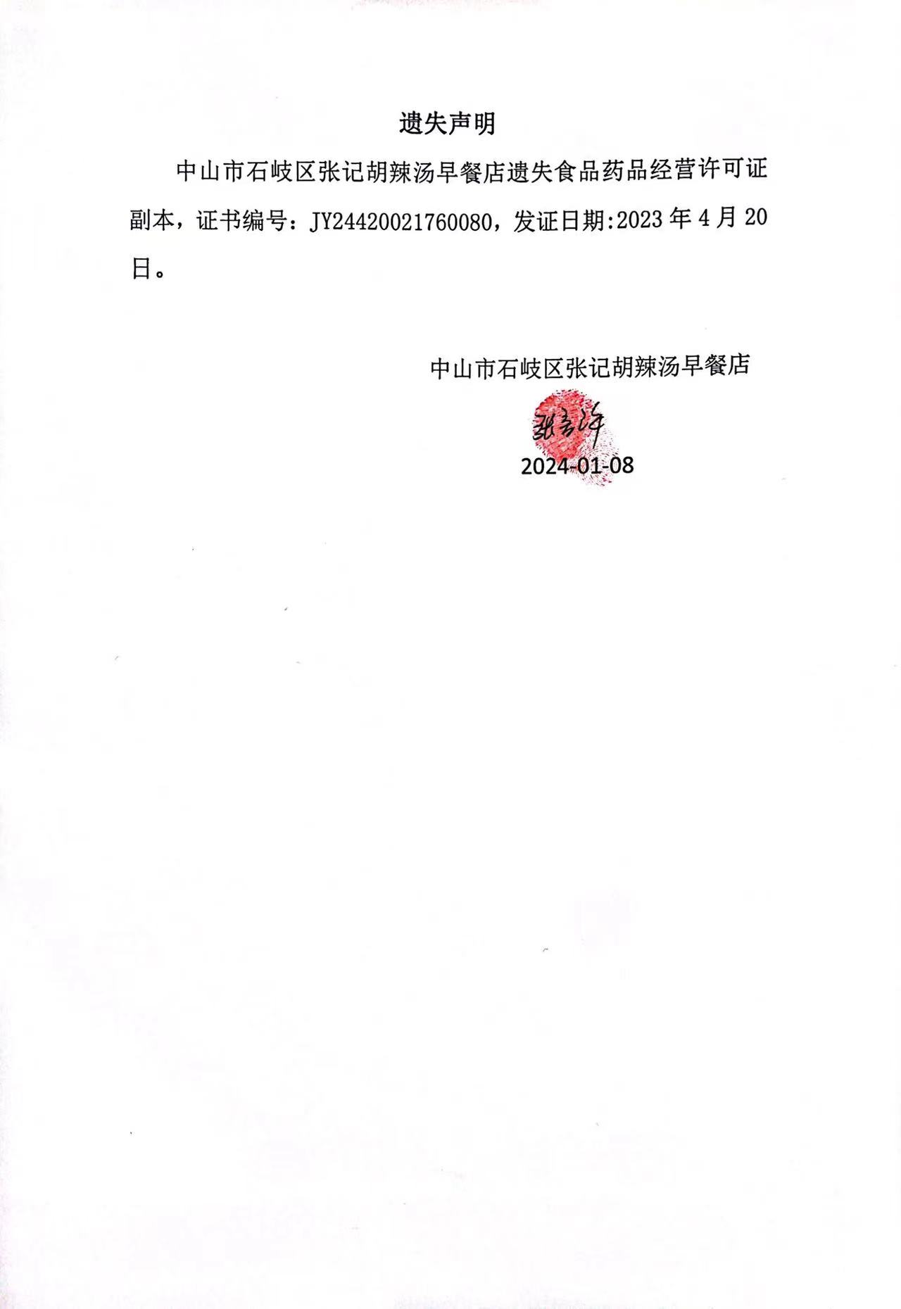 食品药品经营许可证遗失声明(中山市石岐区张记胡辣汤早餐店)